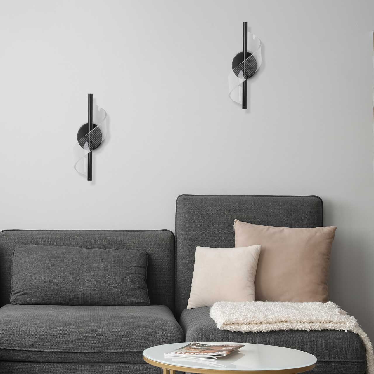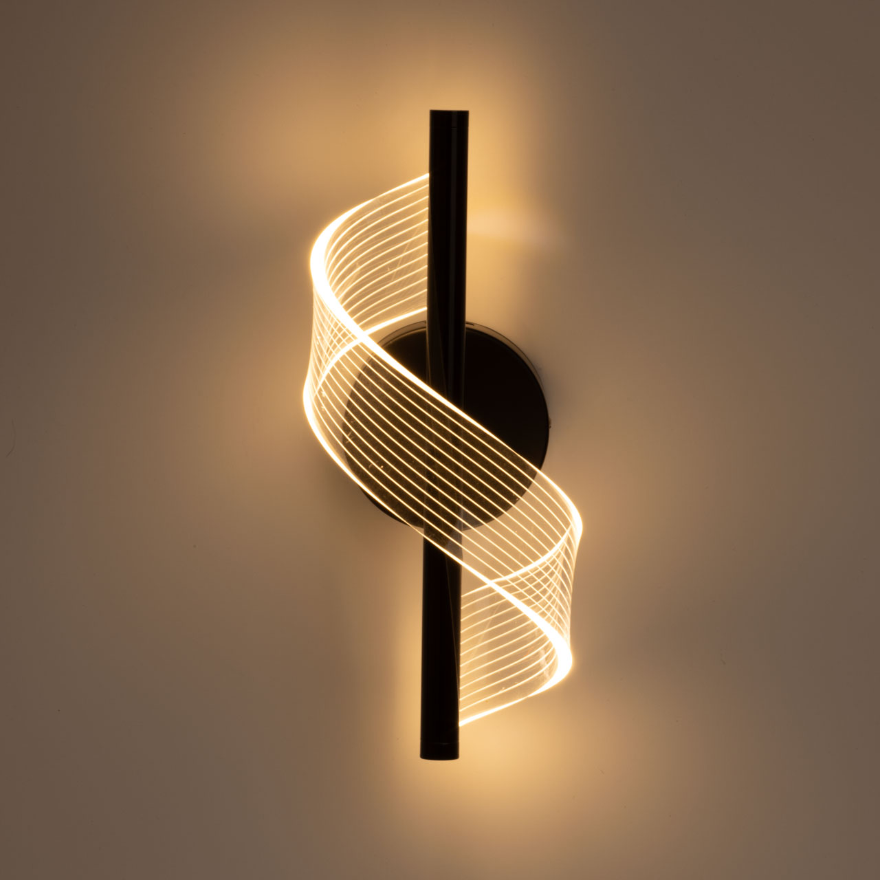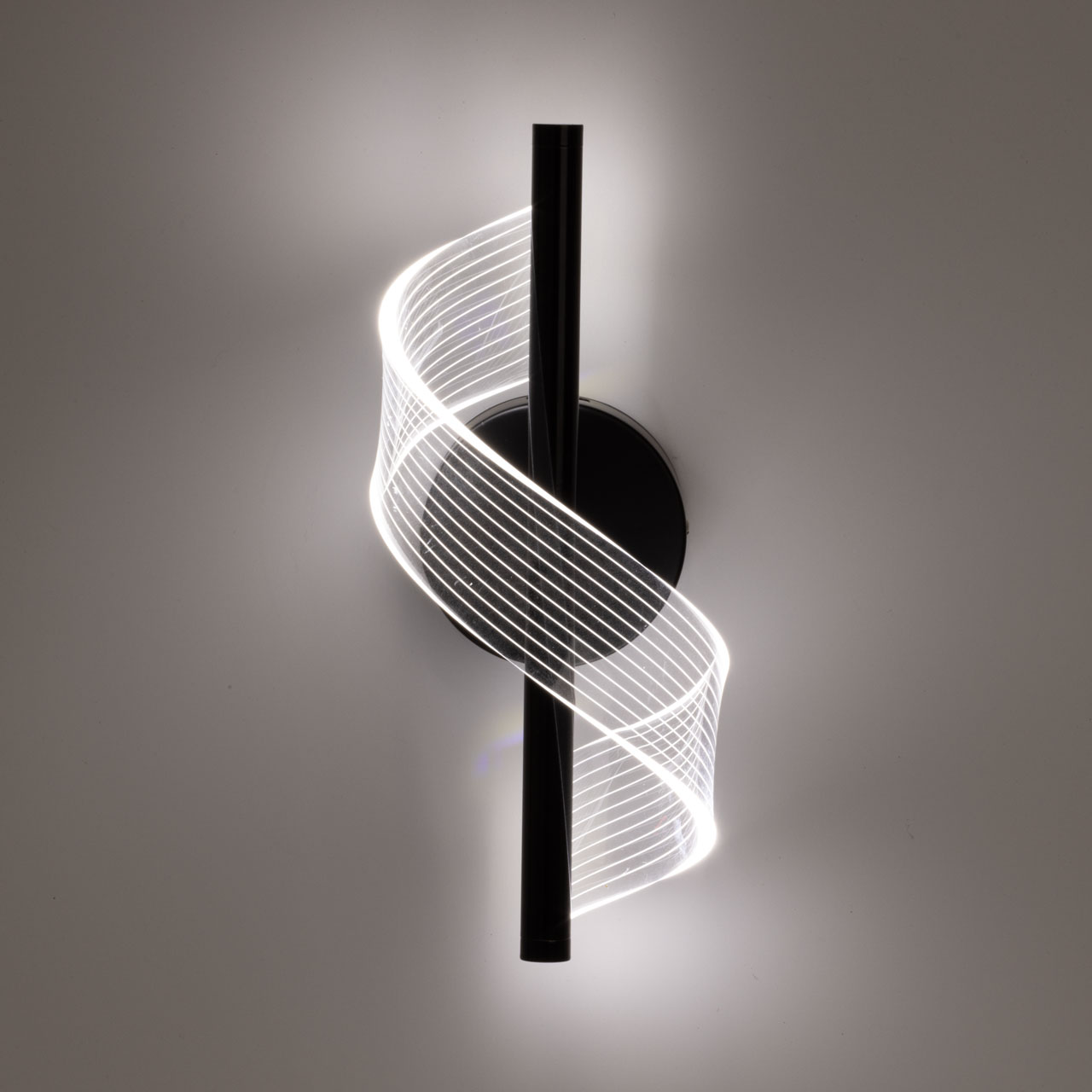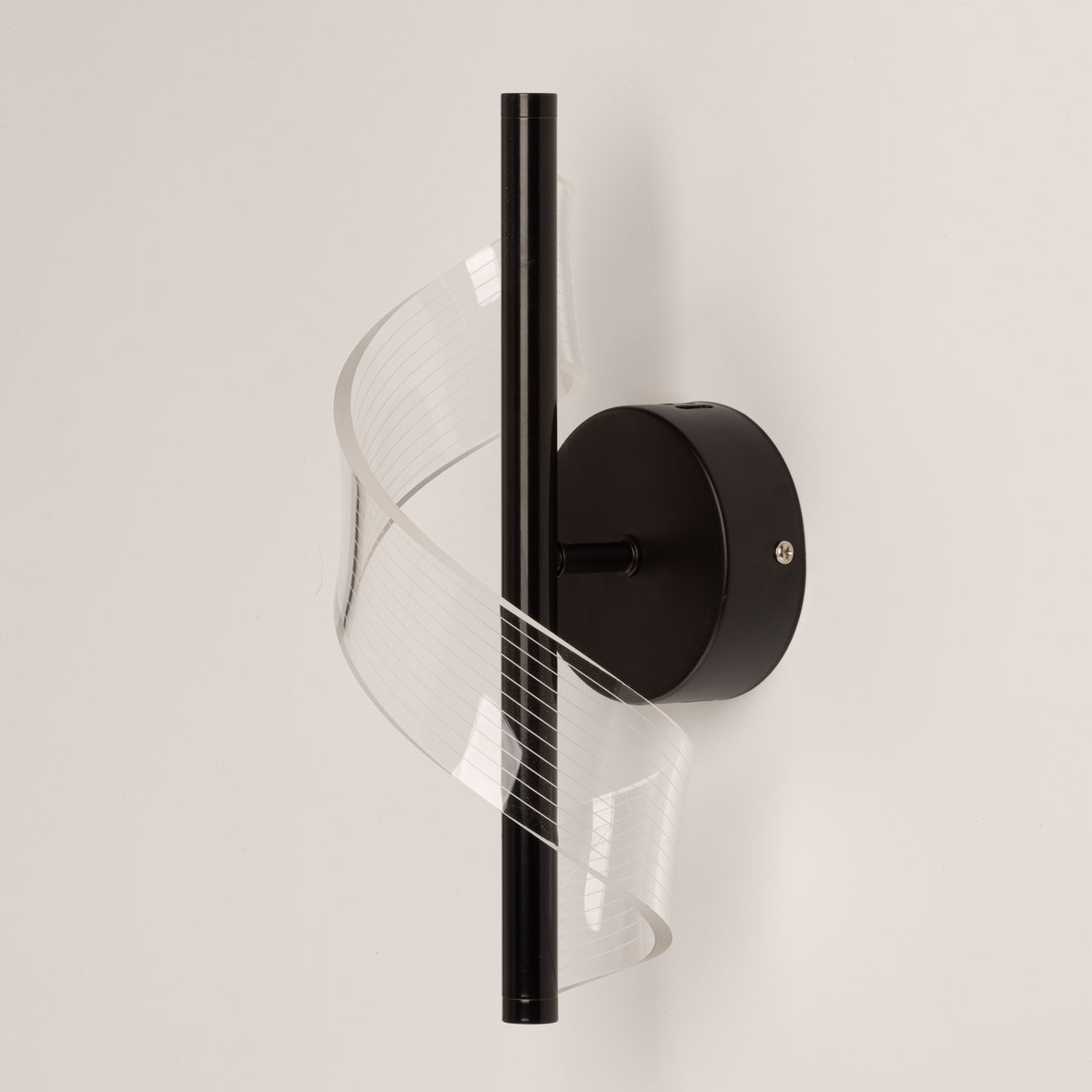 Металлическое основание настенного бра окрашено в черный цвет. Основа плафона выполнена из сплава алюминия с цинком и окрашена в цвет основания. Настенное бра декорировано прозрачным акриловым плафоном с линейной фактурой.