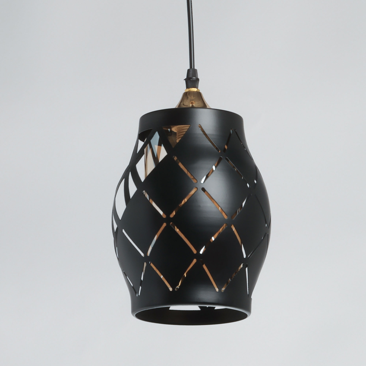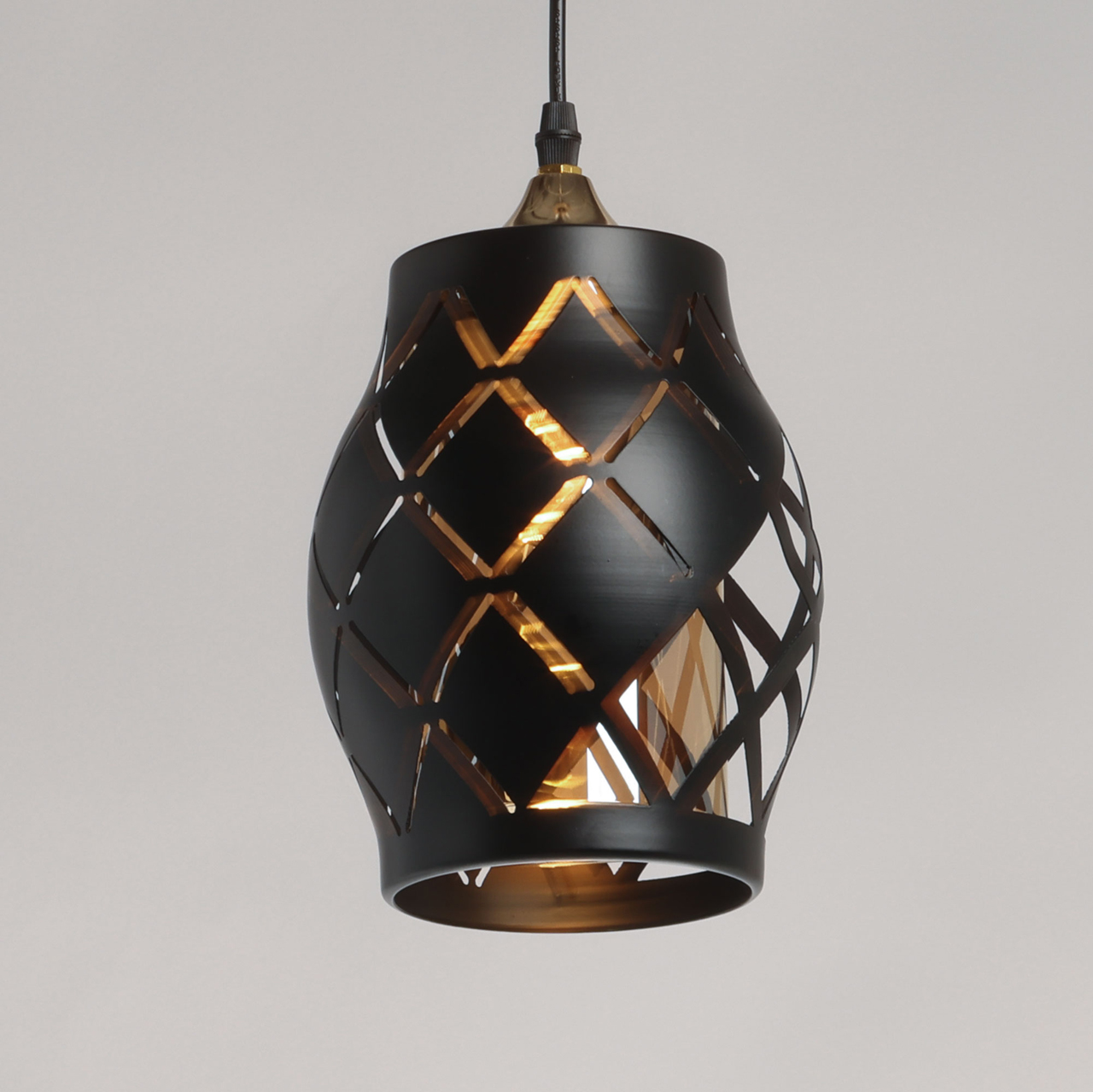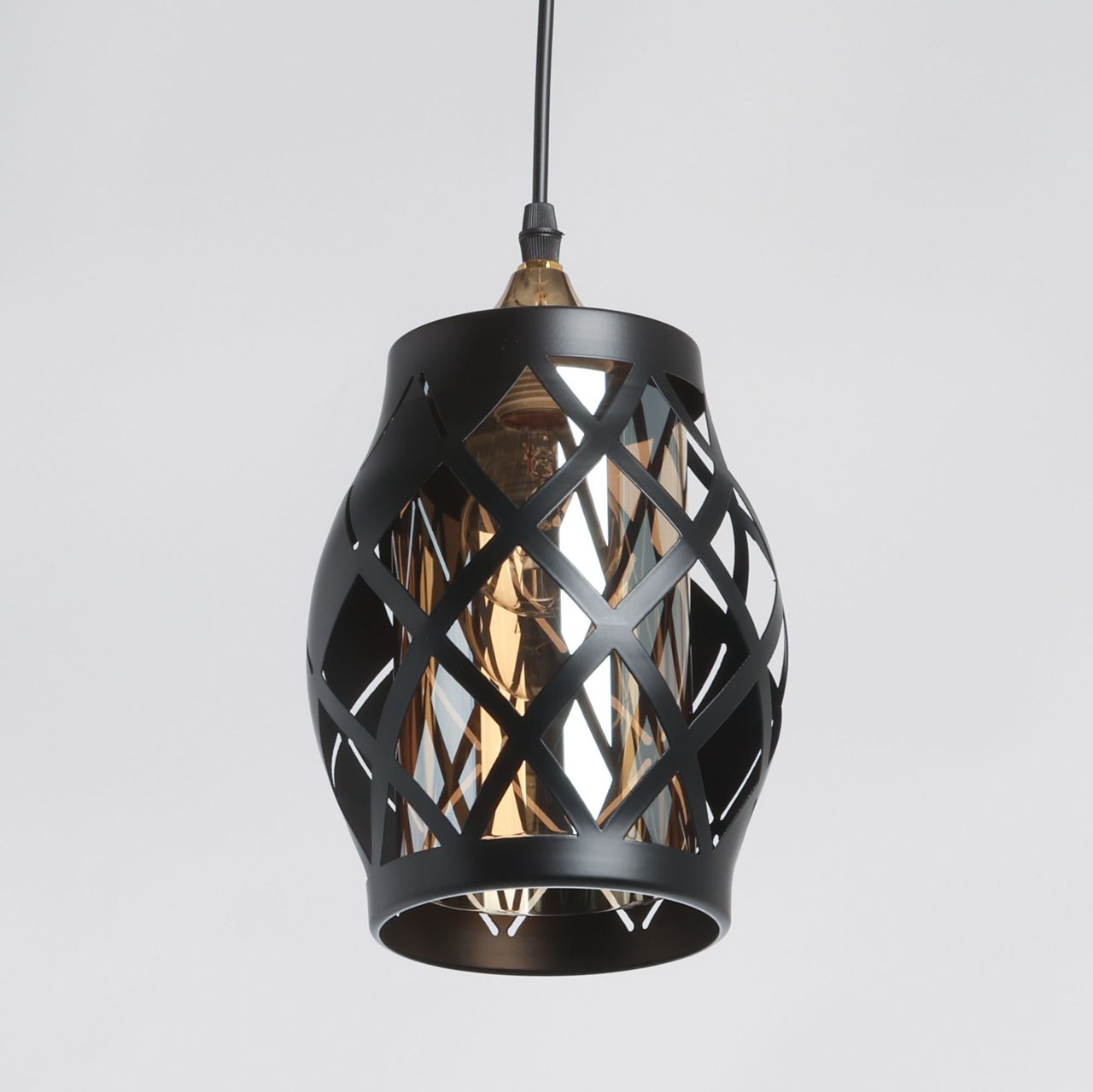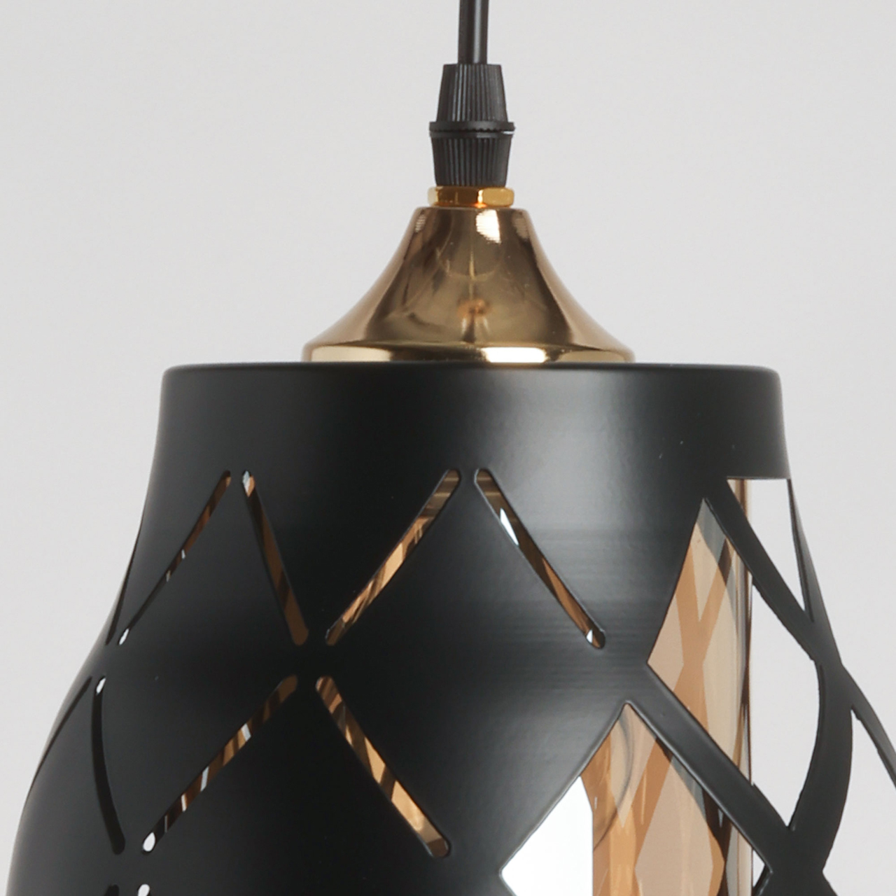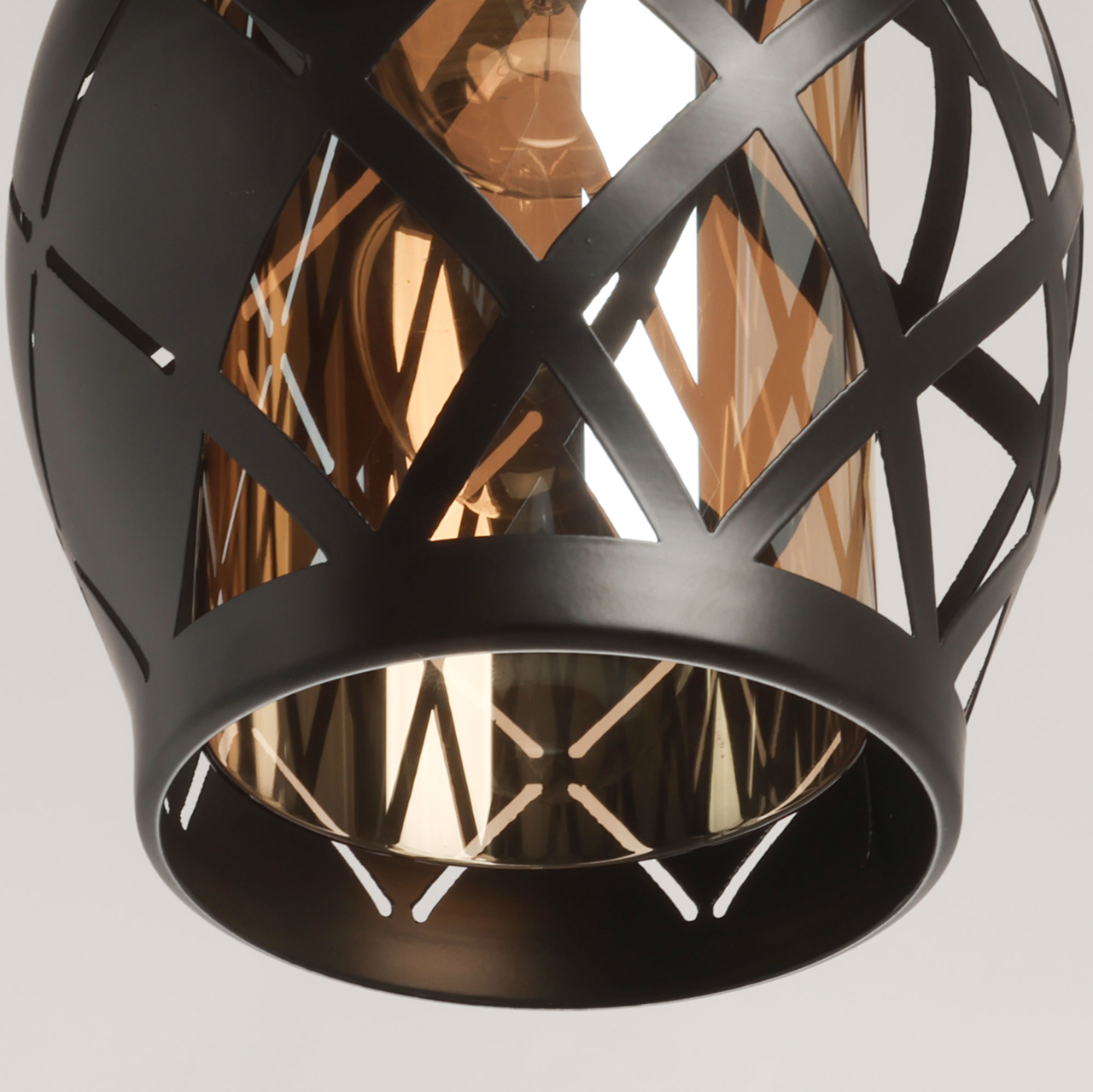 Потолочная чаша и держатель плафона выполнены из металла и гальванизированы в цвет золота. Металлический плафон окрашен в черный цвет. Внутренний стеклянный плафон гальванизирован в цвет шампань.