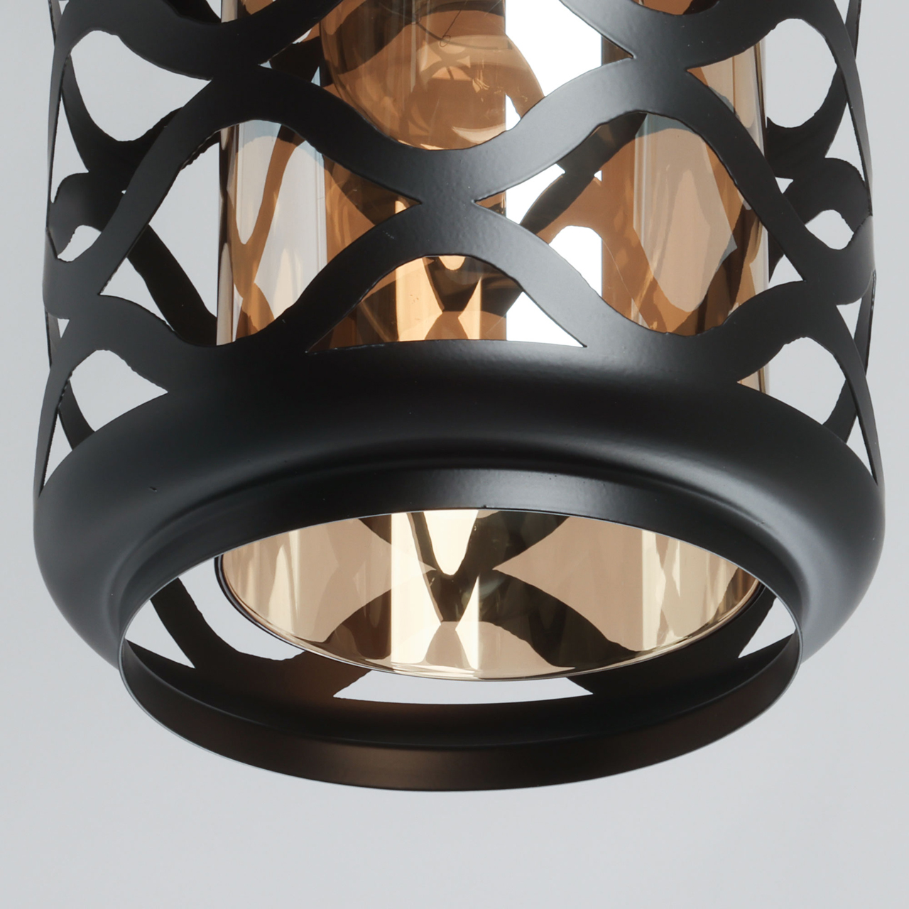 Потолочная чаша и держатель плафона выполнены из металла и гальванизированы в цвет золота. Металлический плфон окрашен в черный цвет. Внутренний стеклянный плафон гальванизирован в цвет шампань.
