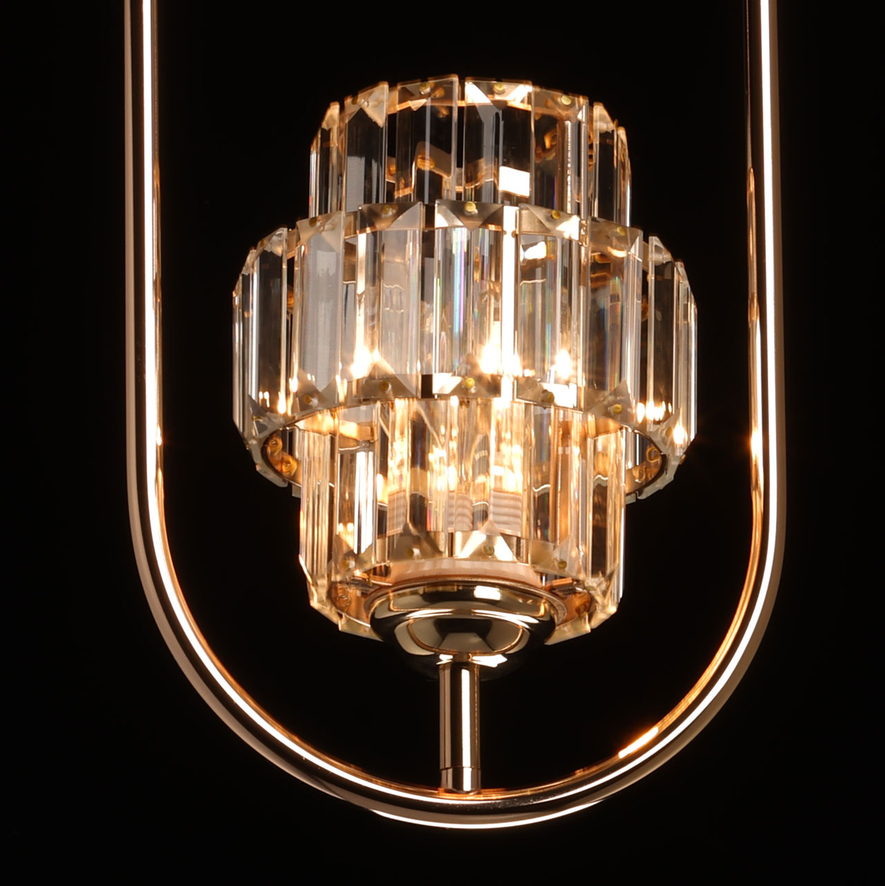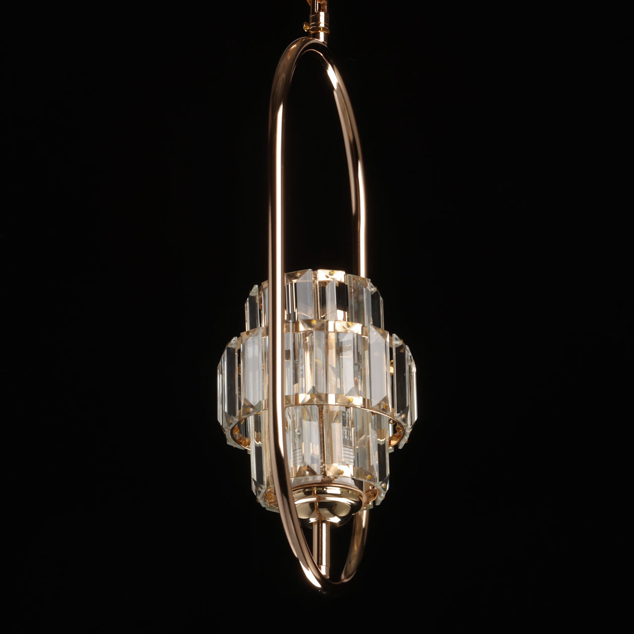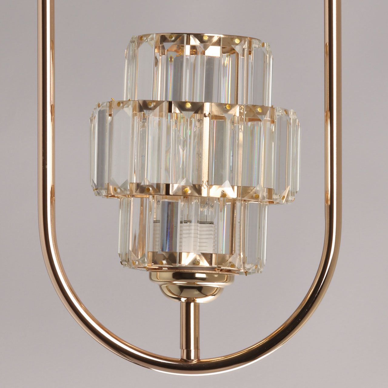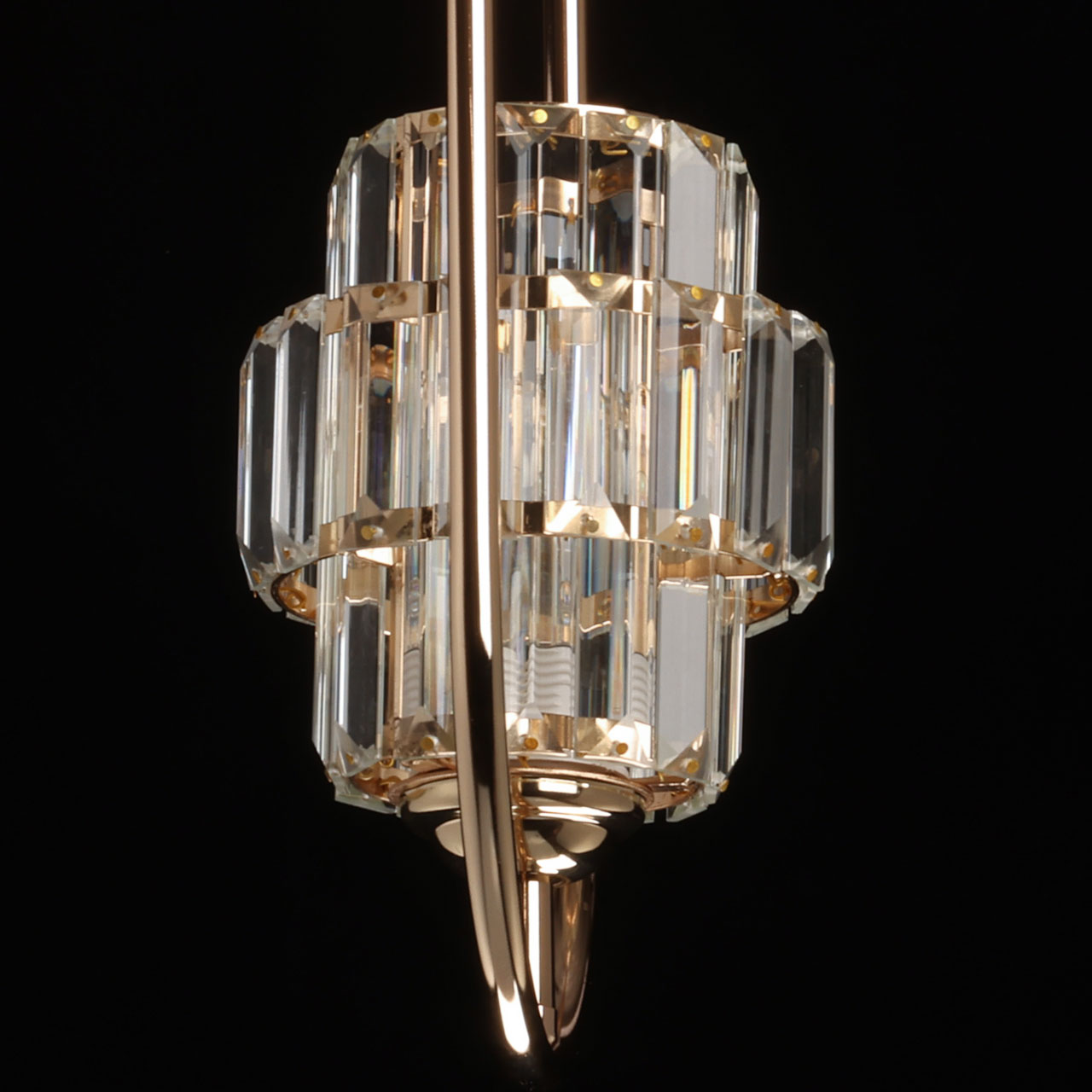Металлическое основание подвеса гальванизировано в цвет золота. Плафон декорирован прозрачным хрусталем прямоугольной формы.