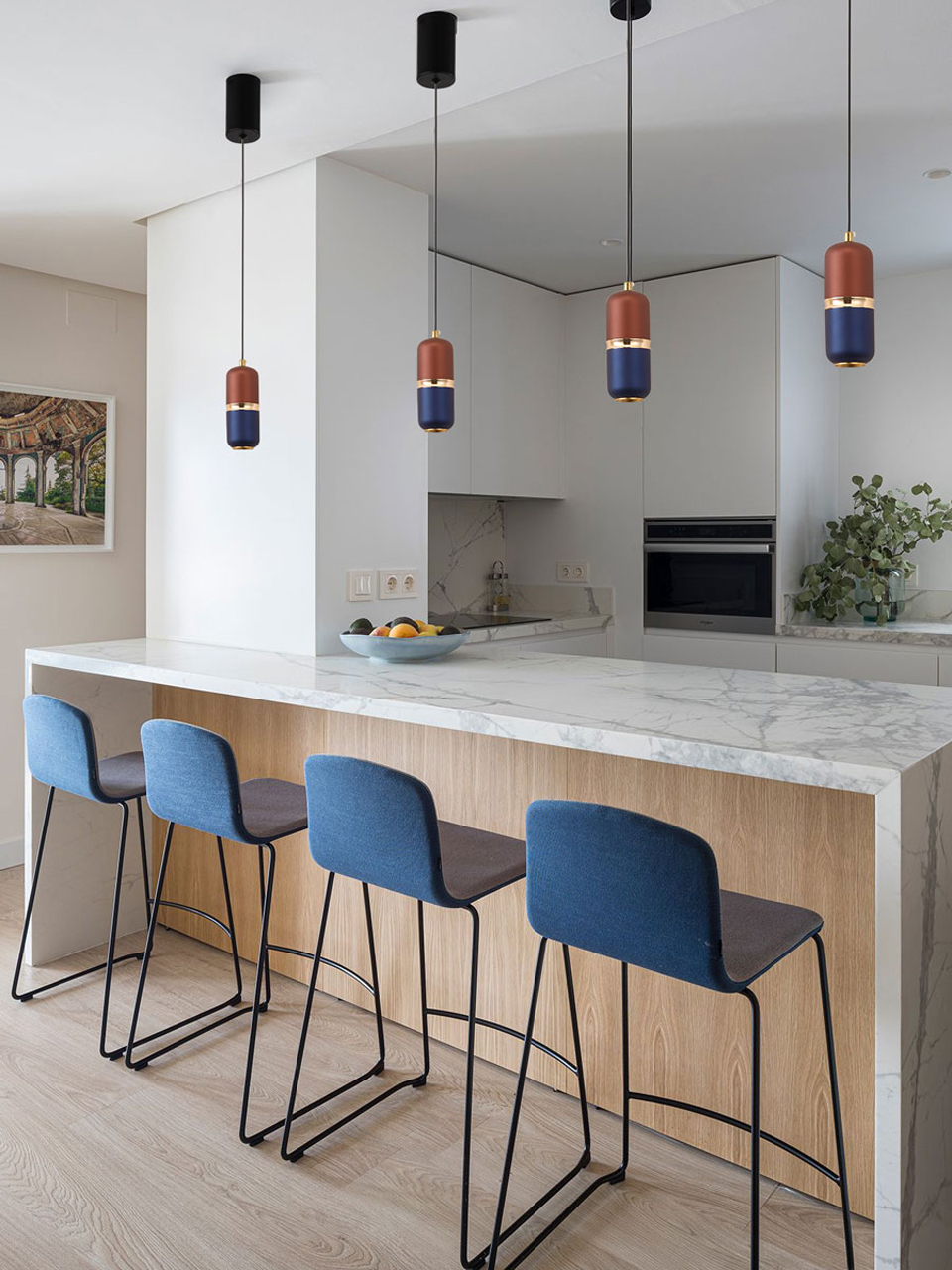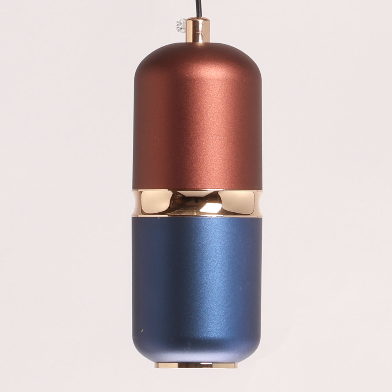 Металлическое основание подвеса окрашено в черный цвет. Корпус плафона выполнен из сплава алюминия и окрашен в синий и коричневый цвета. Отдельные элементы плафона гальванизированы в цвет золота.