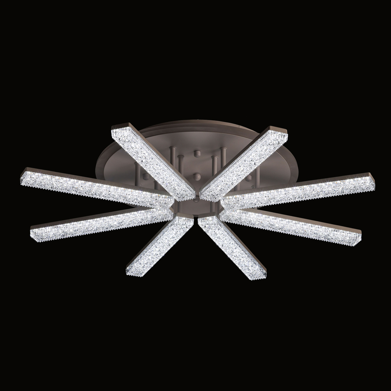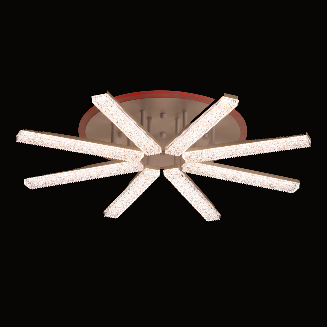 Металлическое основание потолочной люстры окрашено в белый цвет. Светодиодные источники света у потолочной чаши закрыты белым матовым акрилом, на рожках — прозрачным фактурным акрилом.