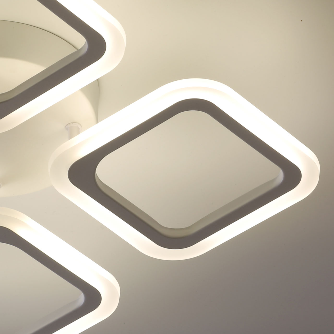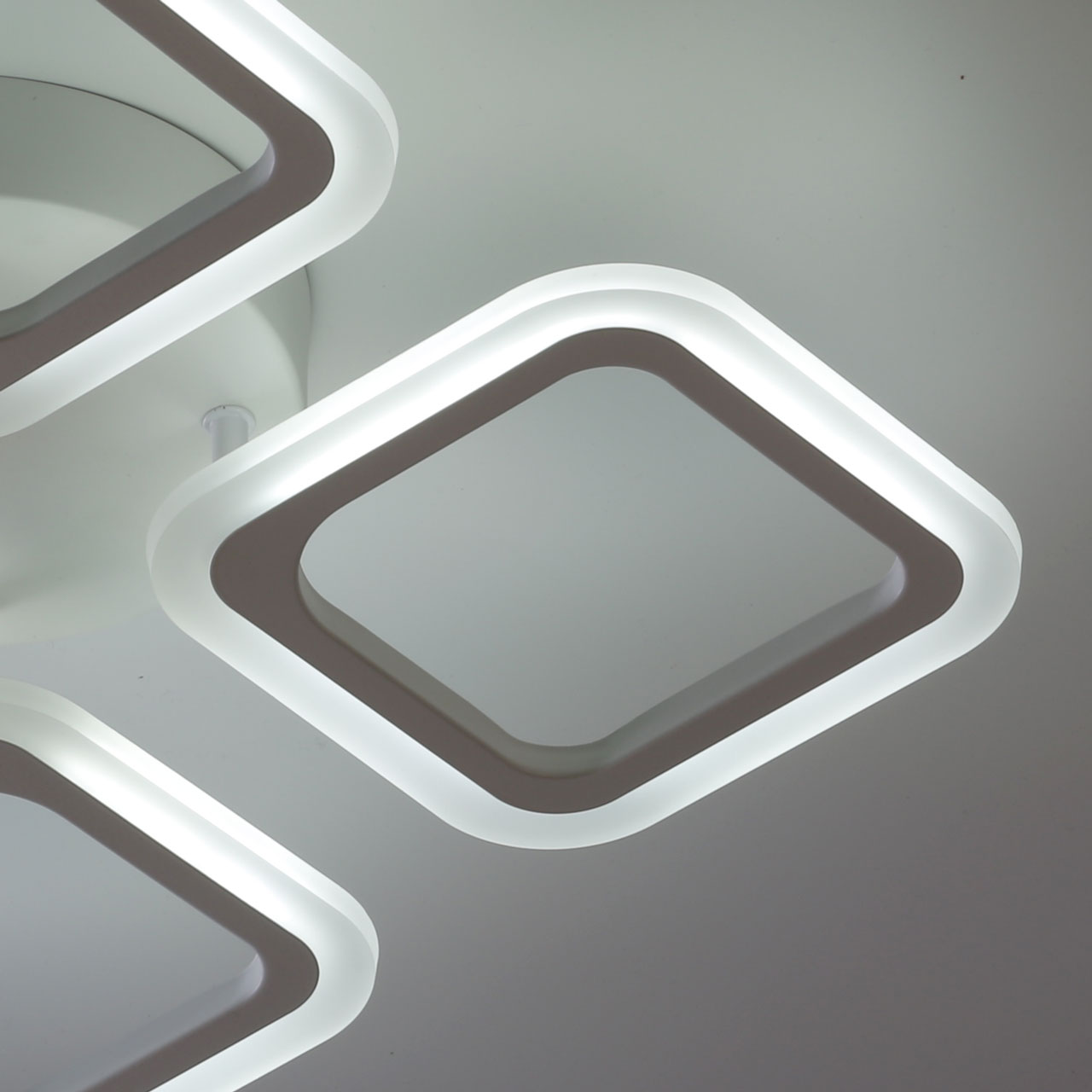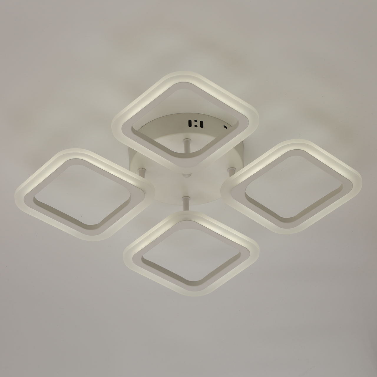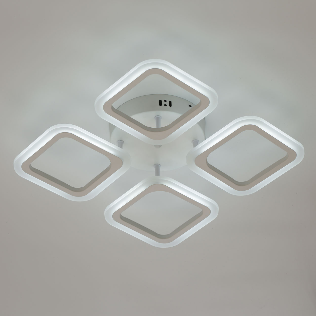 Металлическое основание и плафоны потолочной люстры окрашены в белый цвет. Светодиодные источники света закрыты белым матовым акрилом. Светильник приходит в состоянии частичной сборки в компактной упаковке: вся электрика подсоединена, достаточно закрепить плафоны на корпусе.