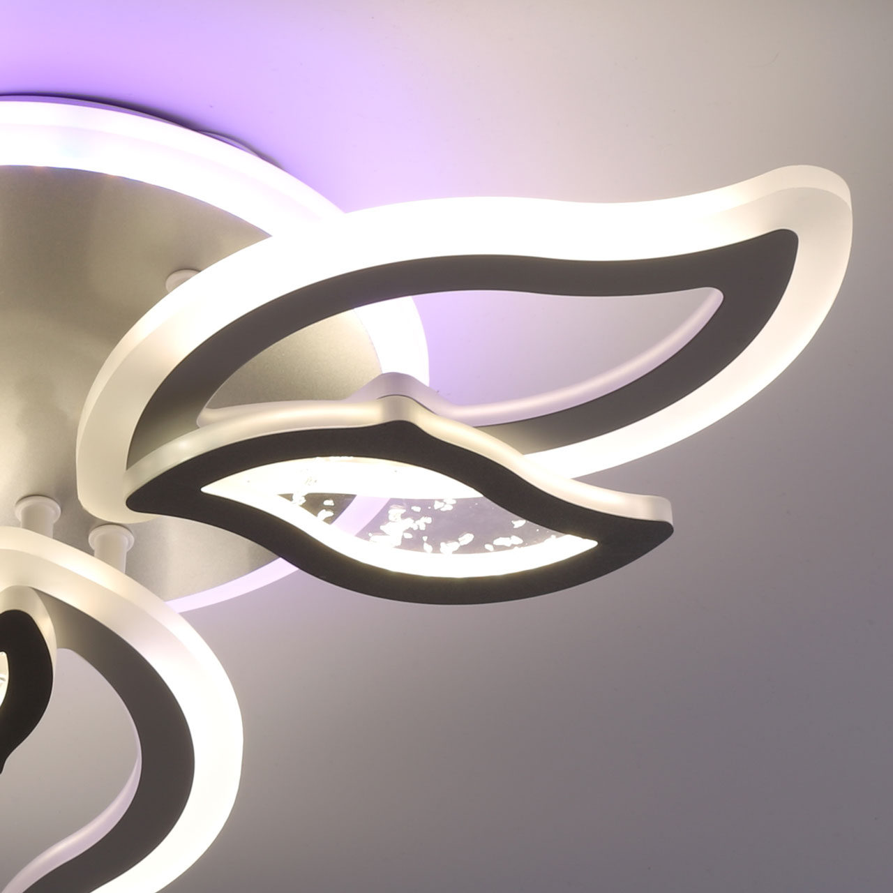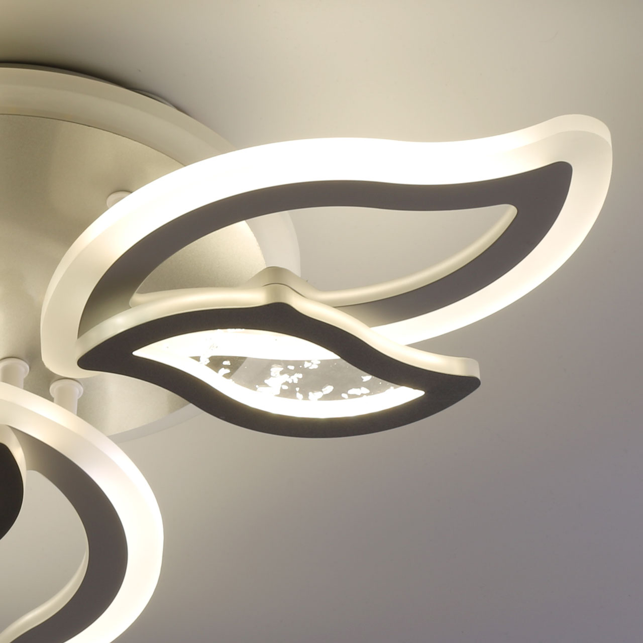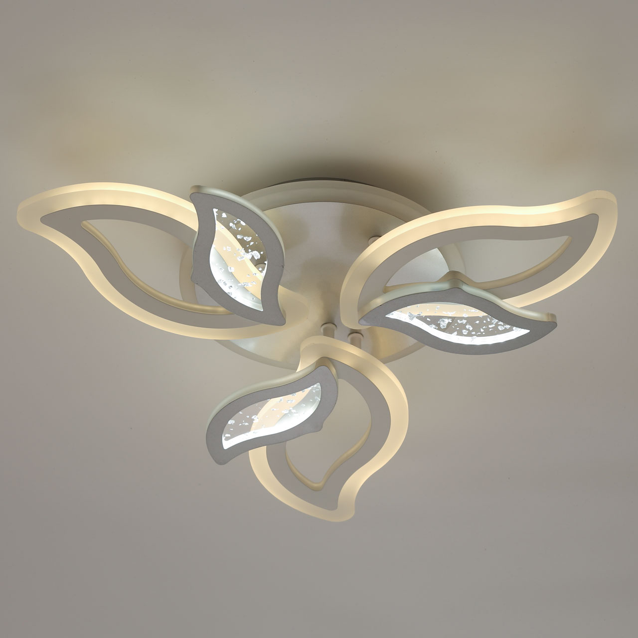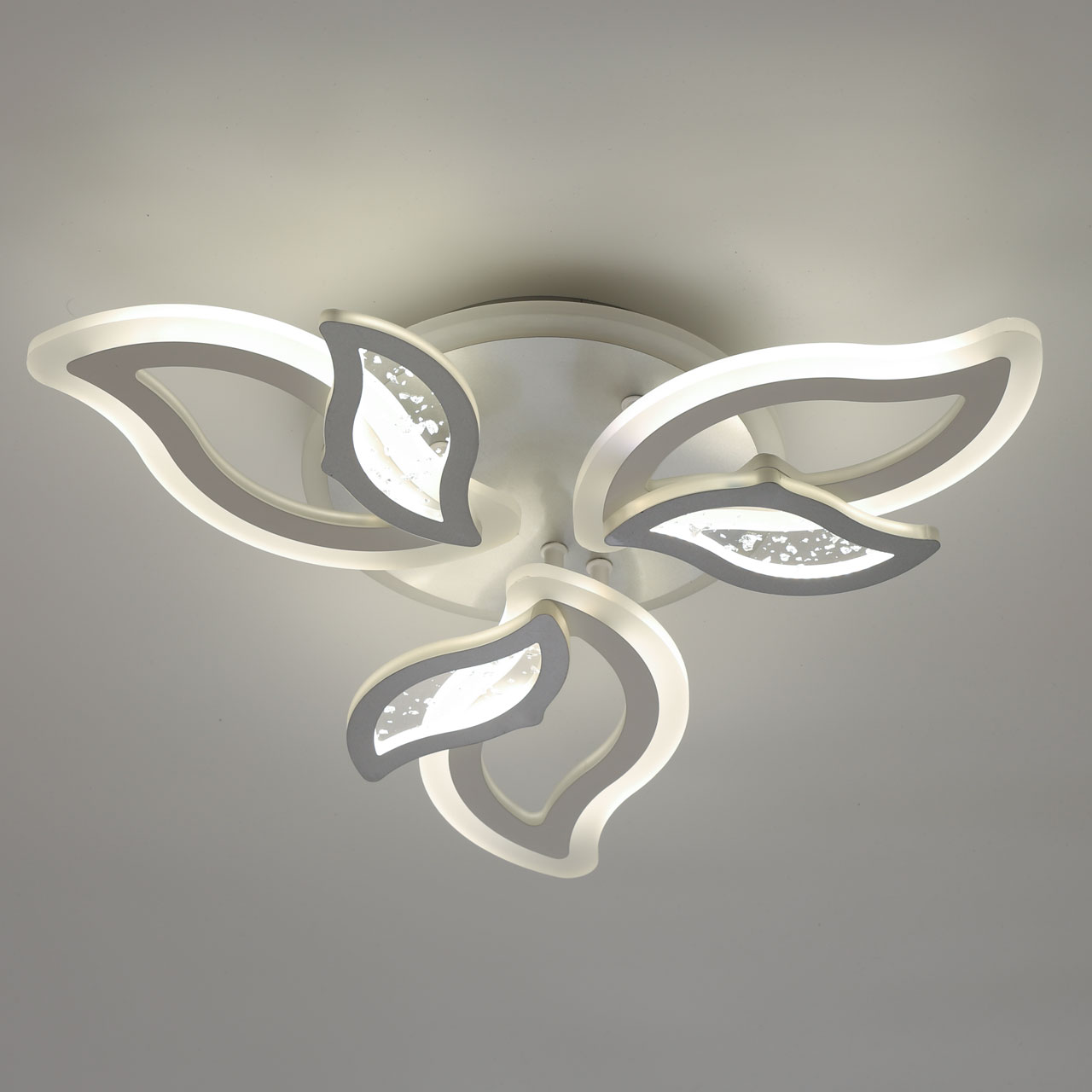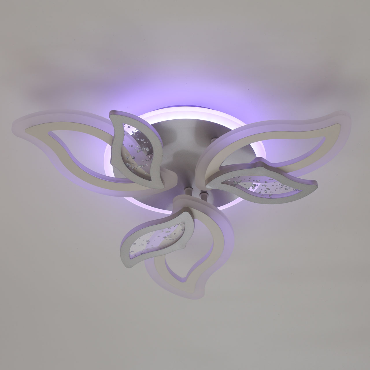 Металлическое основание и плафоны потолочной люстры окрашены в белый цвет. Декоративные плафоны окрашены в цвет серебра. Светодиодные источники света закрыты белым матовым акрилом. Дополнительно, в светильнике предусмотрена подсветка потолочной чаши. Светильник приходит в состоянии частичной сборки в компактной упаковке: вся электрика подсоединена, достаточно закрепить плафоны на корпусе.
