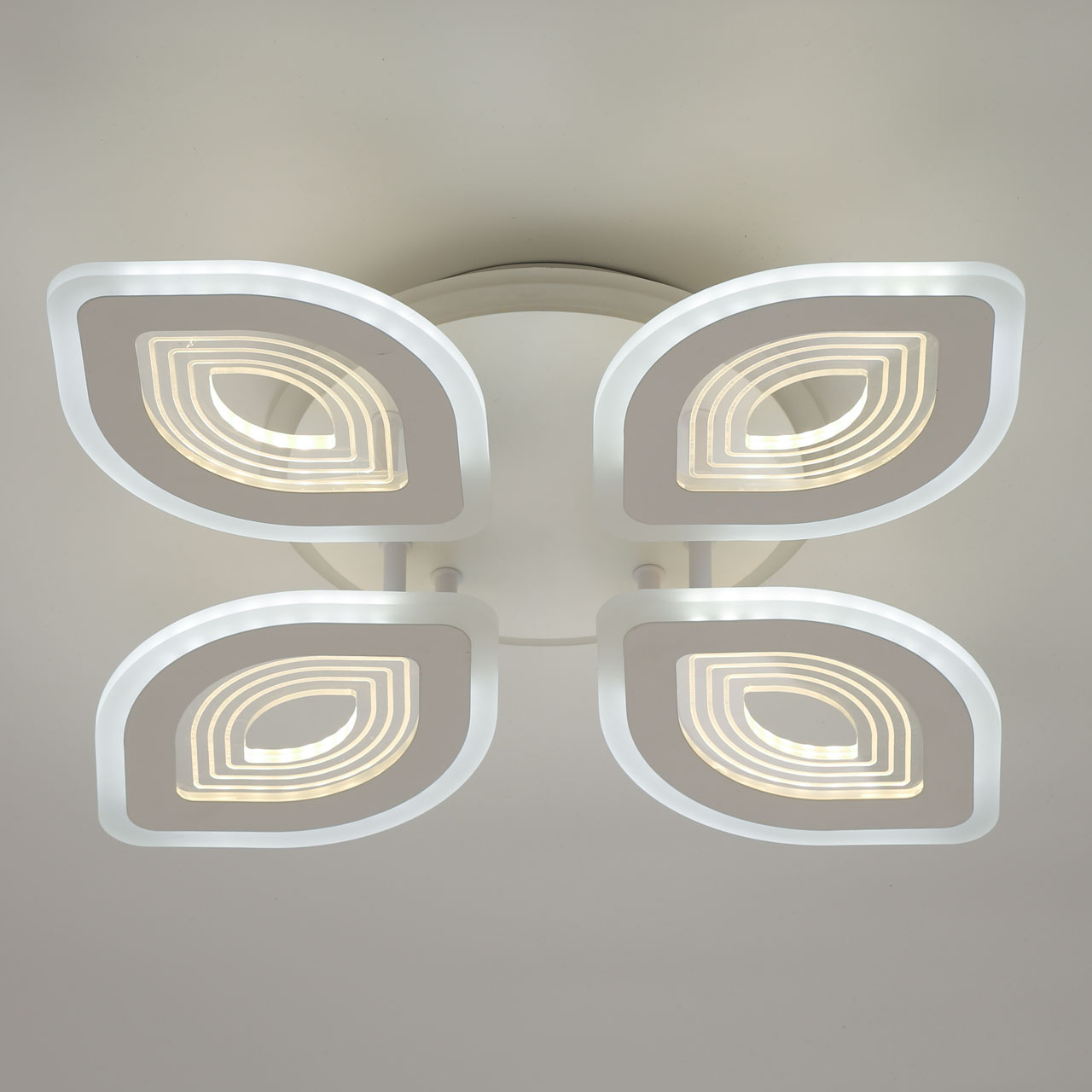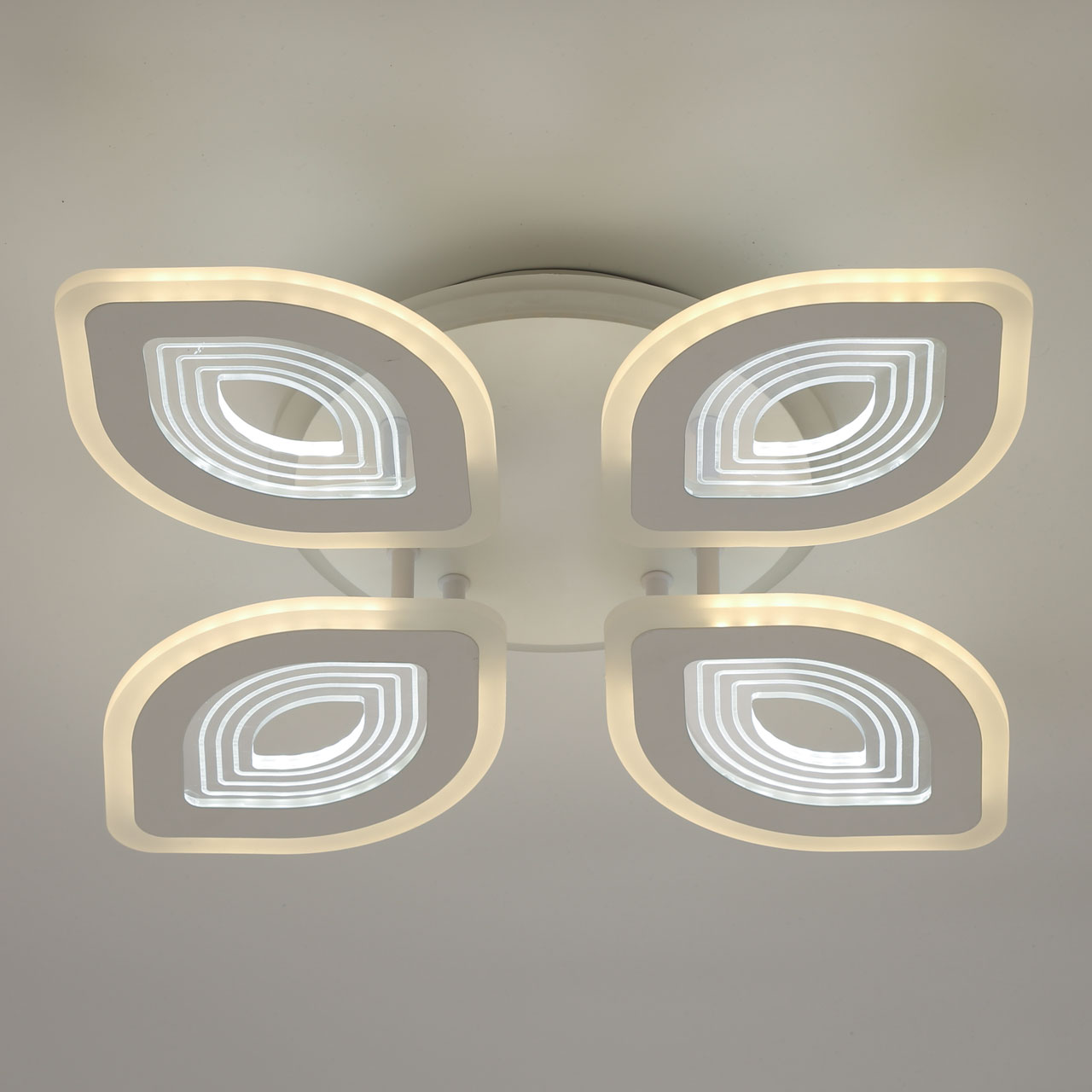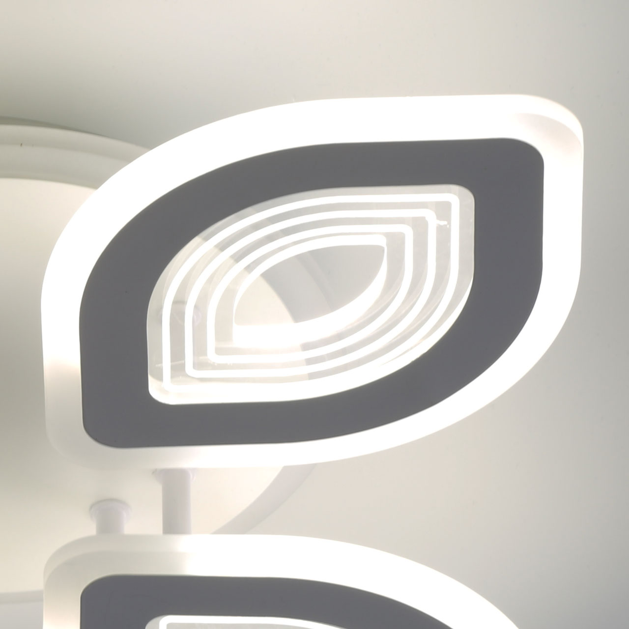Металлическое основание светильника окрашено в белый цвет. Каркас плафона выполнен из сплава алюминия с цинком и окрашен в цвет основания. Светодиодные источники света закрыты белым матовым и прозрачным акрилом. Дополнительно, в светильнике предусмотрена подсветка потолочной чаши. Светильник приходит в состоянии частичной сборки в компактной упаковке: вся электрика подсоединена, достаточно закрепить плафоны на корпусе.