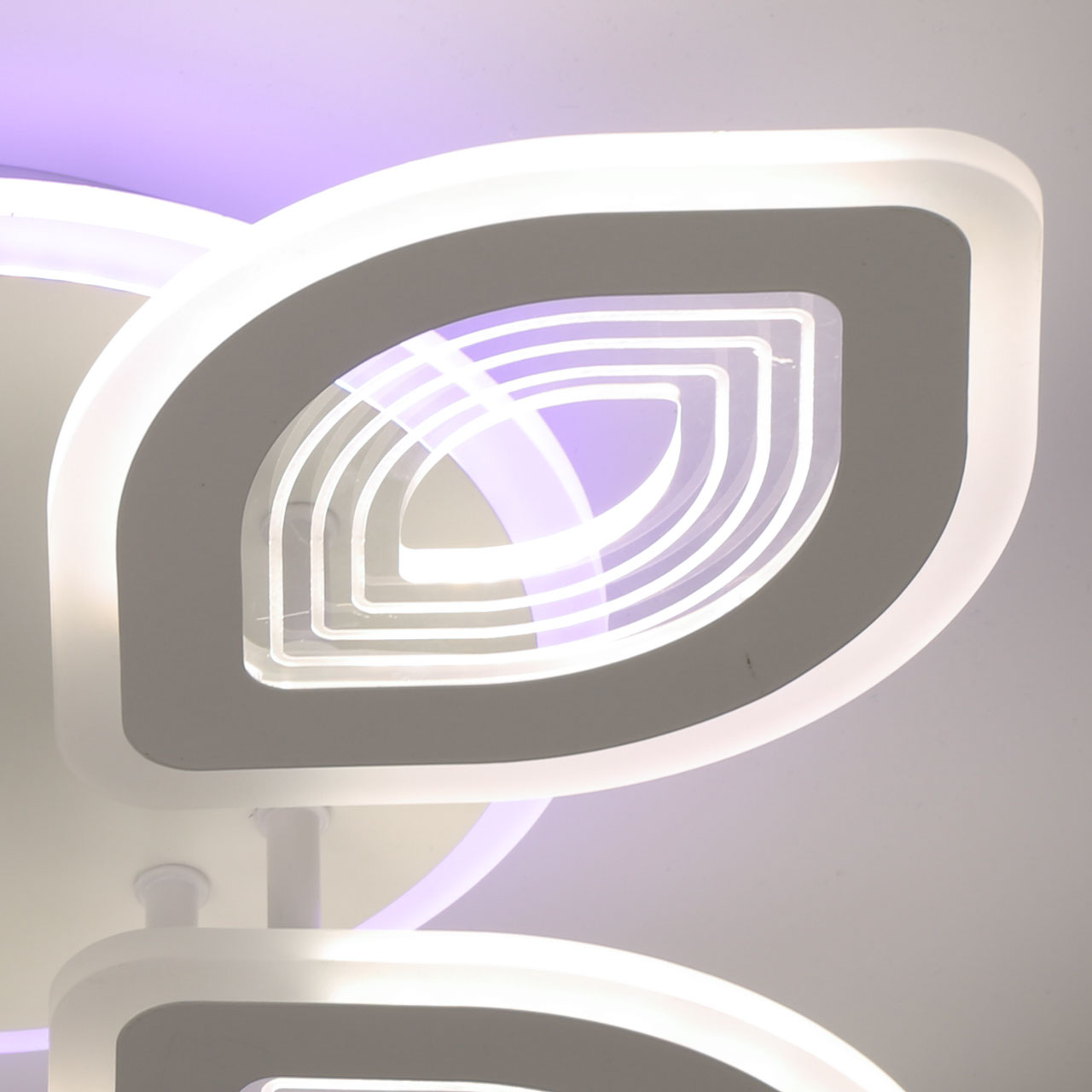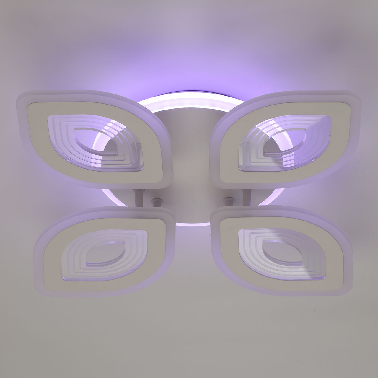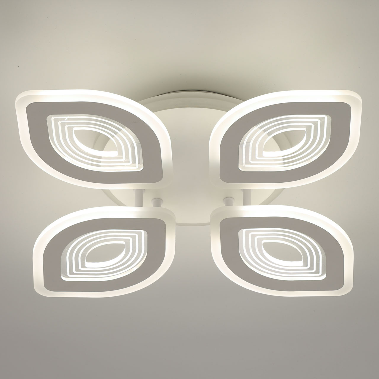 Металлическое основание светильника окрашено в белый цвет. Каркас плафона выполнен из сплава алюминия с цинком и окрашен в цвет основания. Светодиодные источники света закрыты белым матовым и прозрачным акрилом. Дополнительно, в светильнике предусмотрена подсветка потолочной чаши. Светильник приходит в состоянии частичной сборки в компактной упаковке: вся электрика подсоединена, достаточно закрепить плафоны на корпусе.
