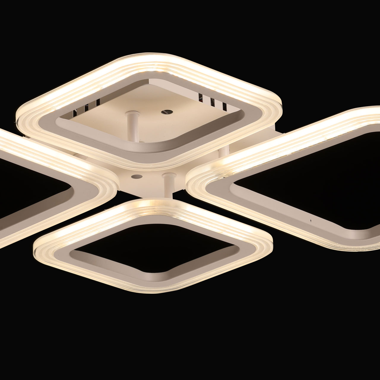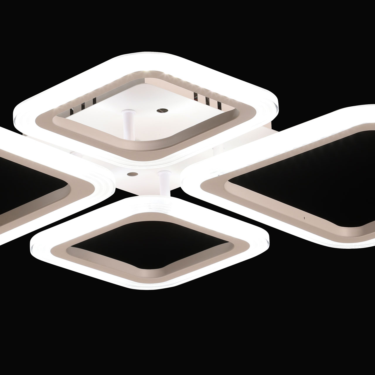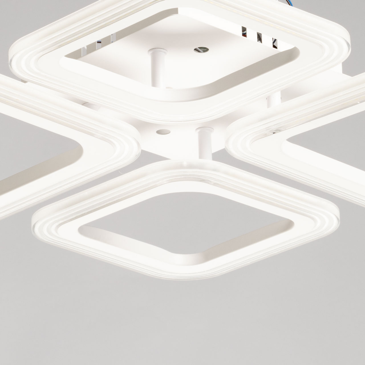 Металлическое основание потолочной люстры окрашено в белый цвет. Корпус плафона выполнен из сплава алюминия с цинком и окрашен в цвет основания. Светодиодный источник света закрыт полупрозрачным акрилом.