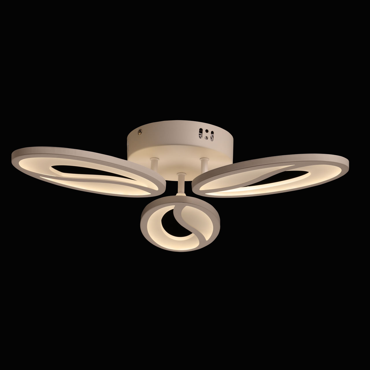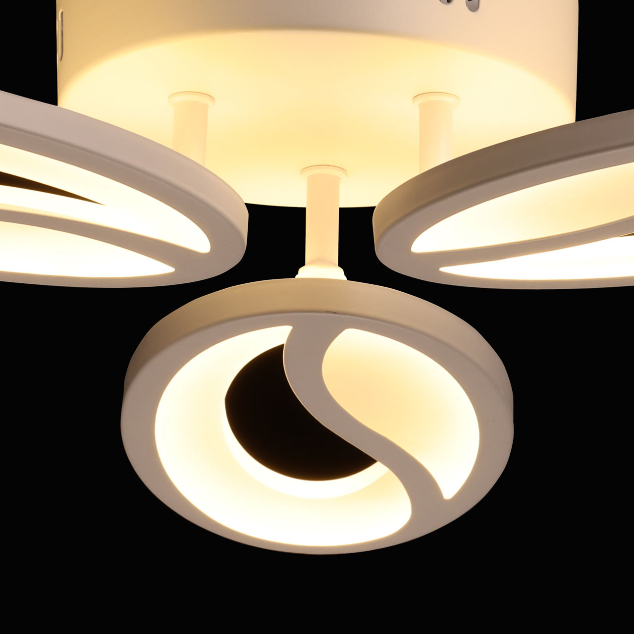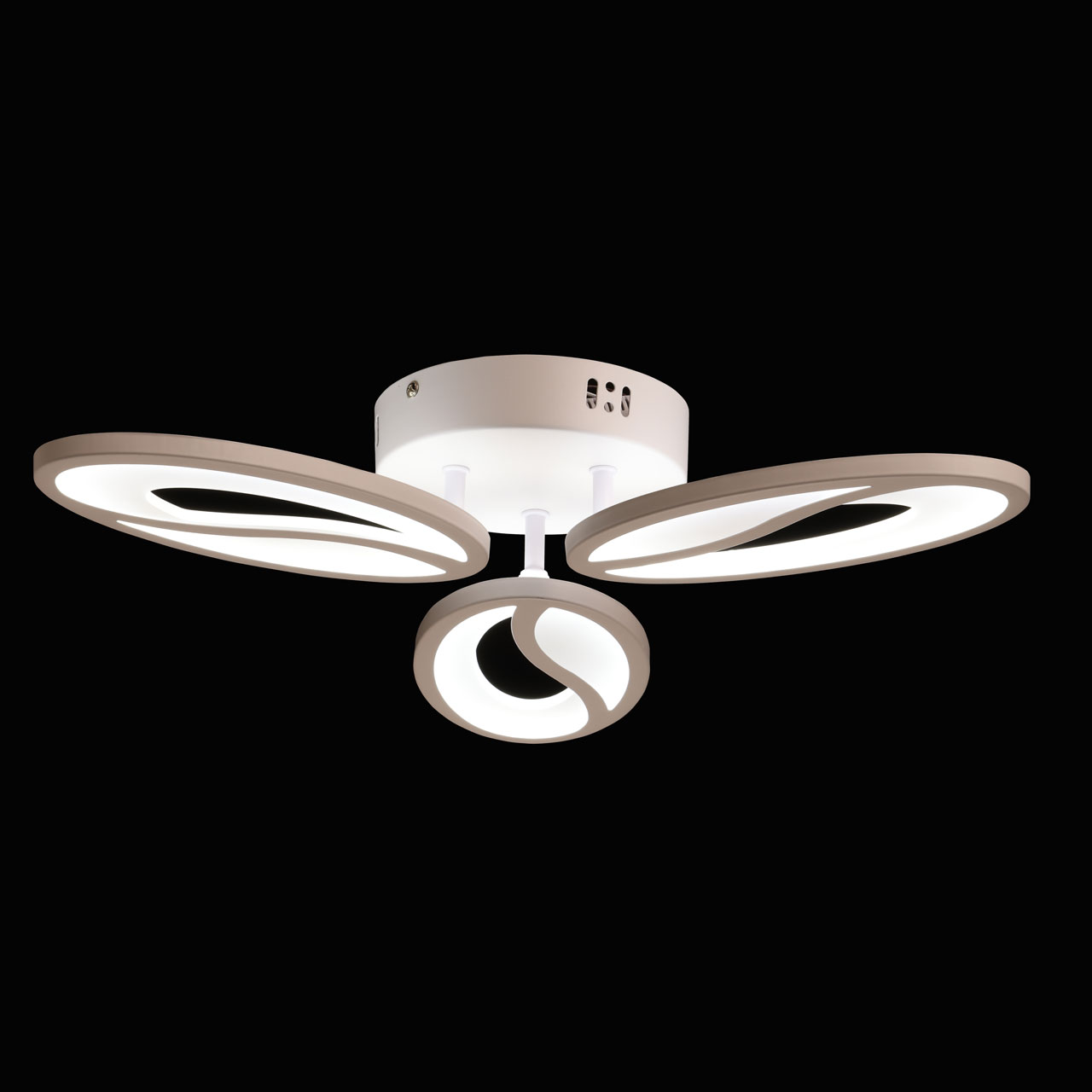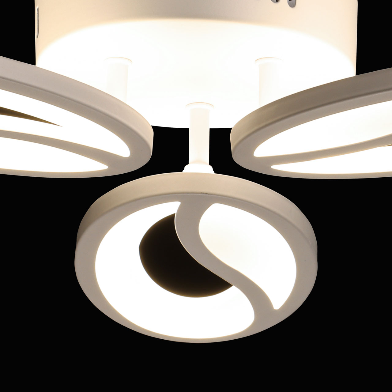 Металлическое основание потолочной люстры окрашено в белый цвет. Корпус плафона выполнен из сплава алюминия с цинком и окрашен в цвет основания. Светодиодный источник света закрыт матовым акрилом.