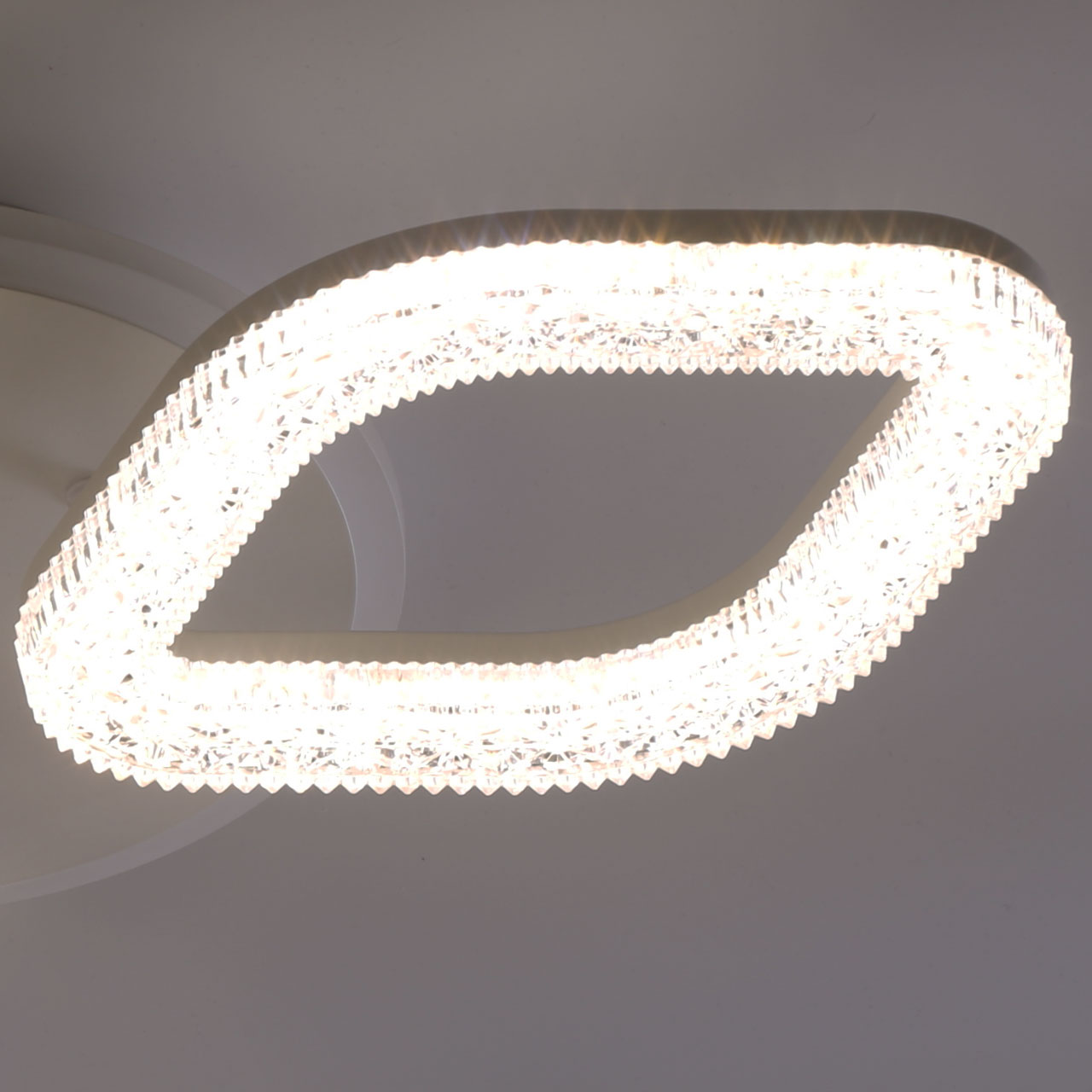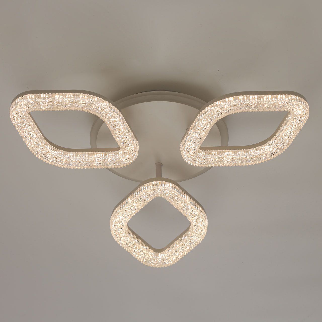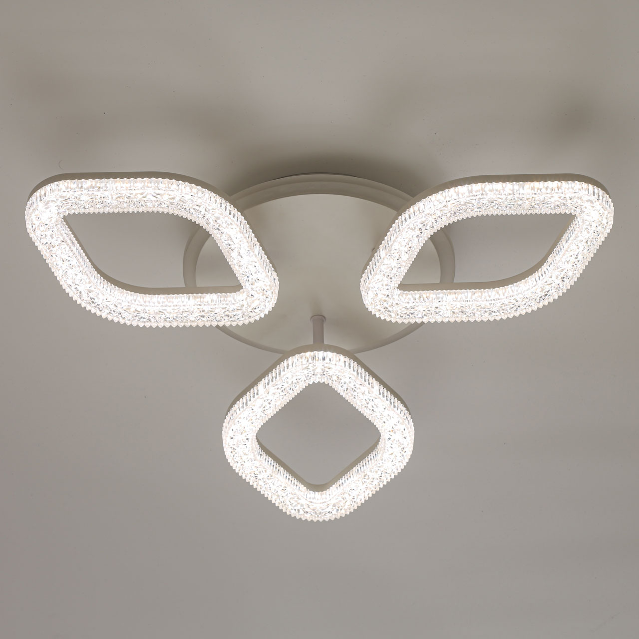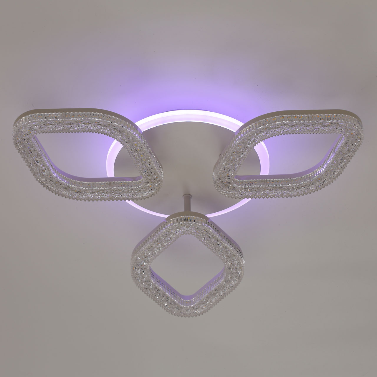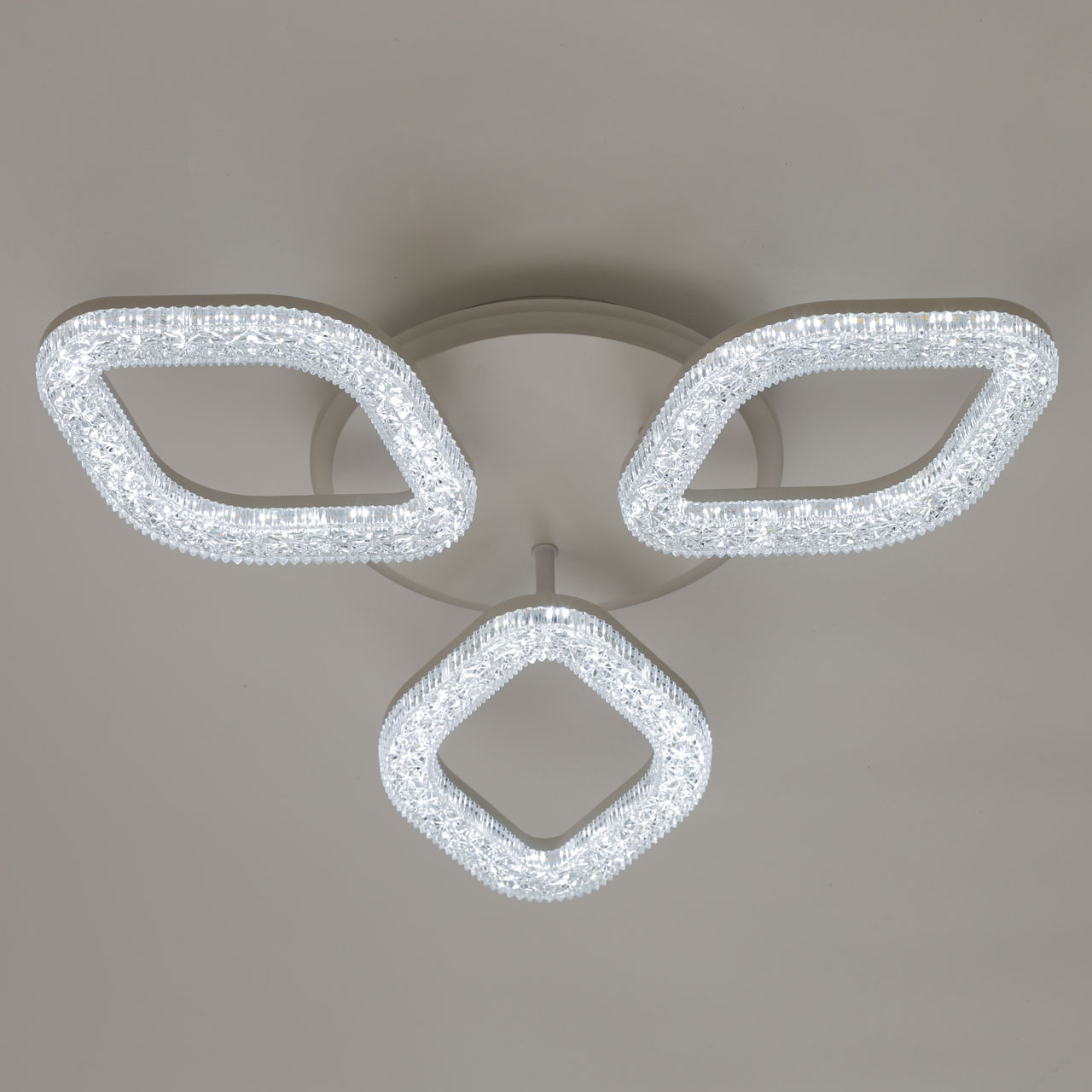 Металлическое основание светильника окрашено в белый цвет. Каркас плафона выполнен из сплава алюминия с цинком и окрашен в цвет основания. Светодиодные источники света на потолочной чаше закрыты белым матовым и прозрачным фактурным акрилом. Дополнительно, в светильнике предусмотрена подсветка потолочной чаши. Светильник приходит в состоянии частичной сборки в компактной упаковке: вся электрика подсоединена, достаточно закрепить плафоны на корпусе.