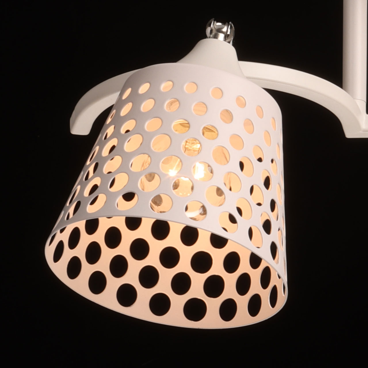 Металлическое основание потолочной люстры окрашено в белый цвет. Отдельные элементы основания гальванизированы в цвет хрома. Металлические плафоны перфорированы и окрашены в цвет основания. Светильник декорирован элементами из светлого натурального дерева.