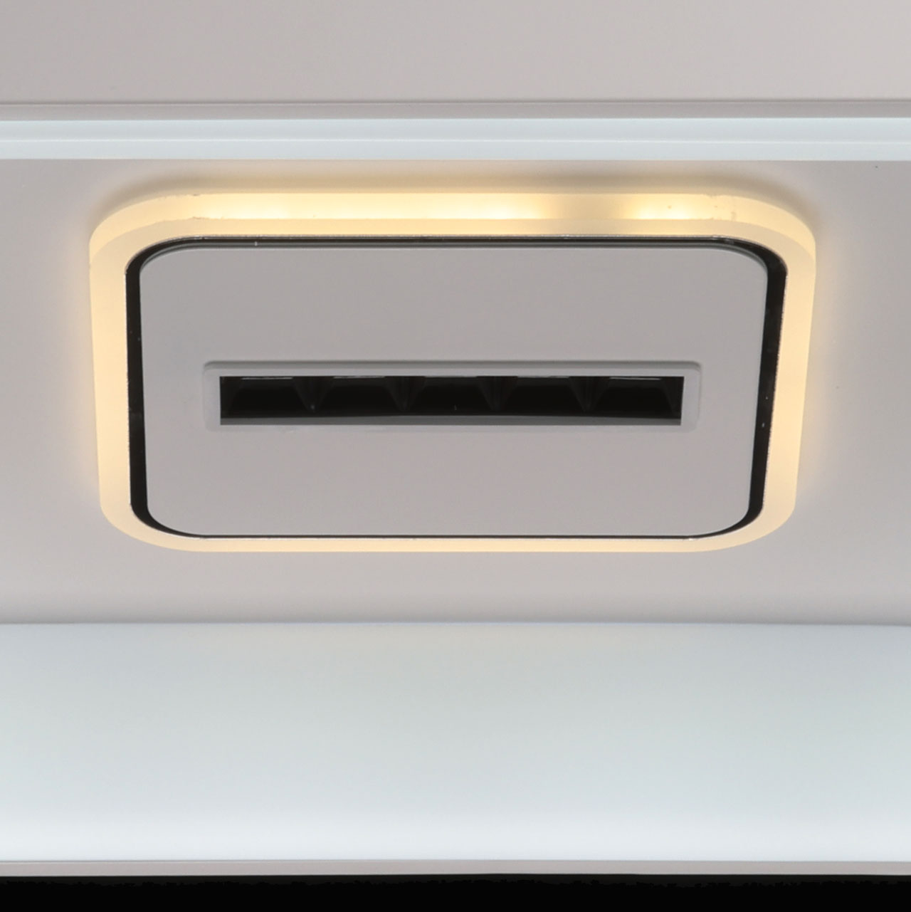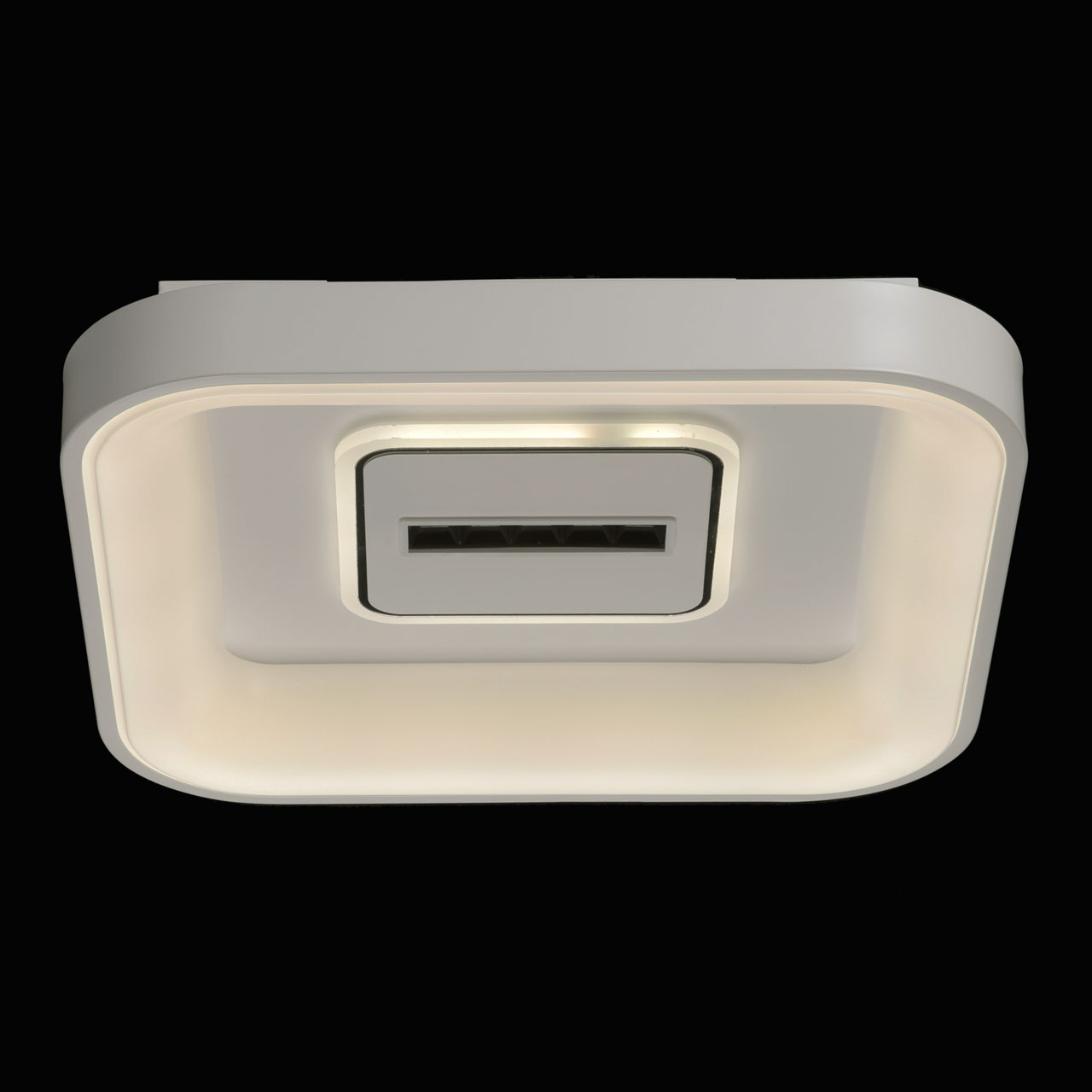 Металлическое основание светильника окрашено в белый цвет. Светодиодные источники света закрыты белым матовым акрилом. В центр светильника, выделенного металлическим кантом, гальванизированным в цвет хрома, на пластине из сплава алюминия, окрашенной в металлический цвет, встроены 5 светодиодов функционального освещения. В комплект входит пульт.