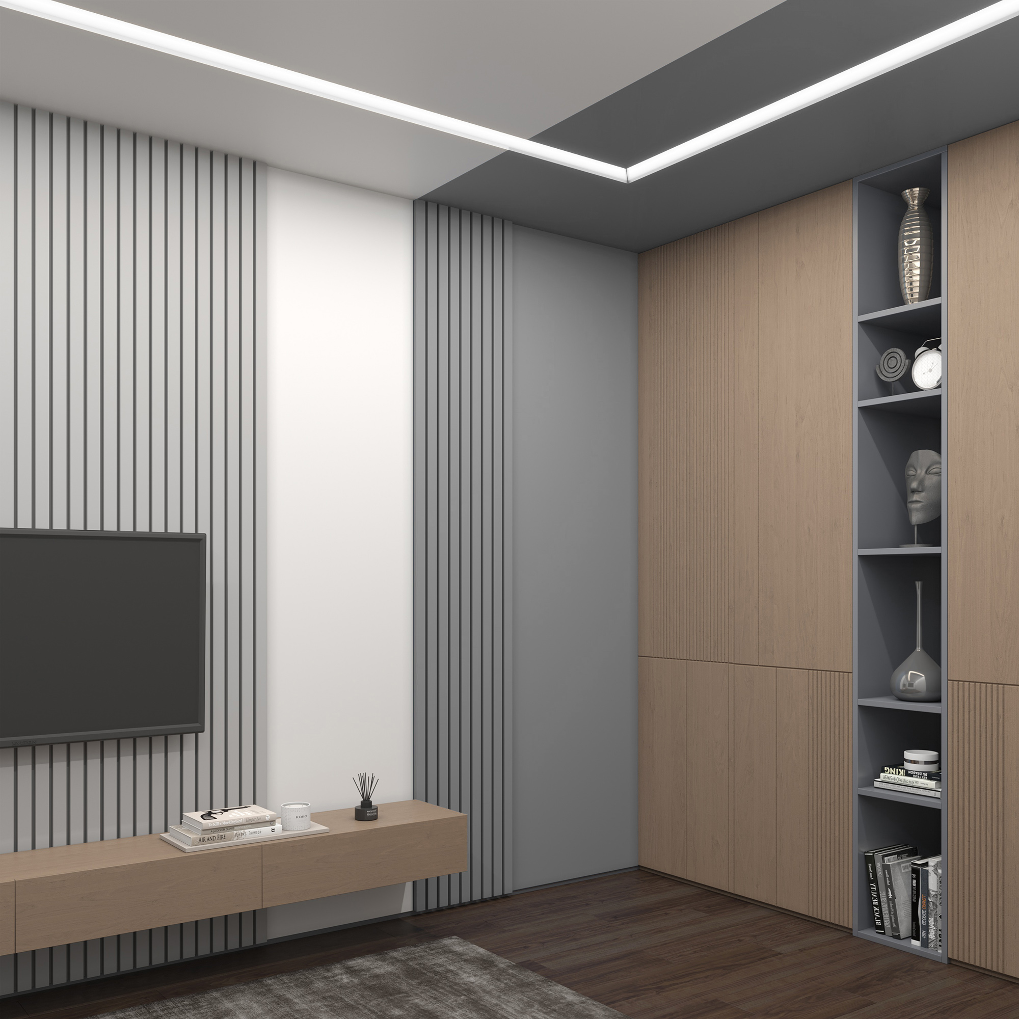 Соединительный элемент (угол 90) встраиваемой профильной гипсовой системы освещения прямого выхода света SABER 100 для установки в потолках и стенах из гипсокартона.
