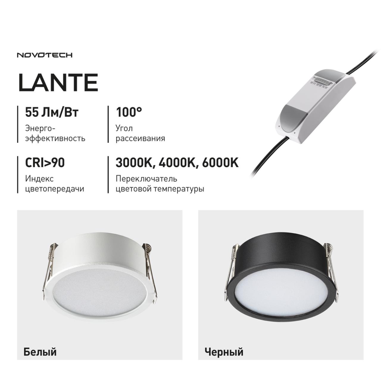 Встраиваемые светодиодные светильники линии LANTE с переключателем цветовой температуры 3000К (теплый белый) -4000К (нейтральный белый) -6000К (холодный белый).