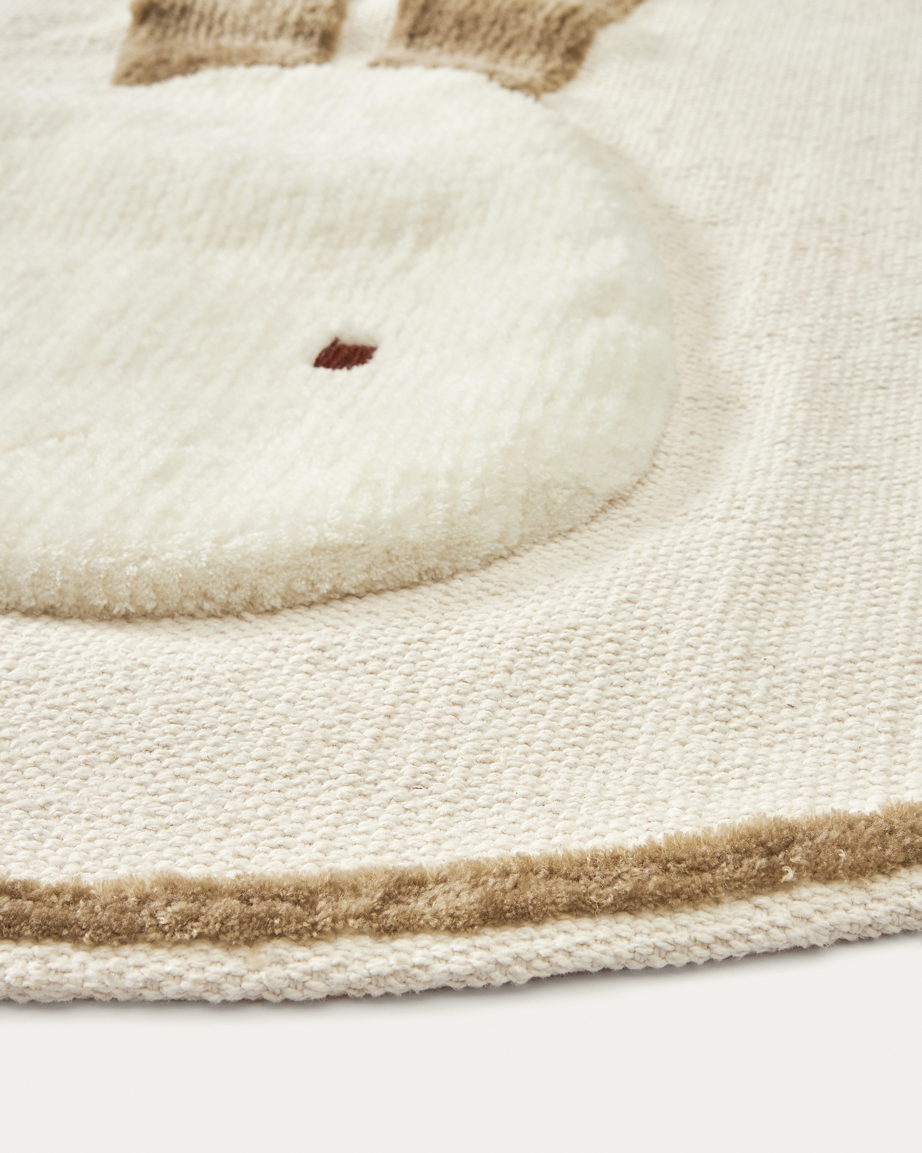 Форма коврика круглая, окантована бежевой шерстяной нитью. В коллекции Yanil два варианта принта — заяц с набивными ушами из шерсти и мелкие разноцветные листья.