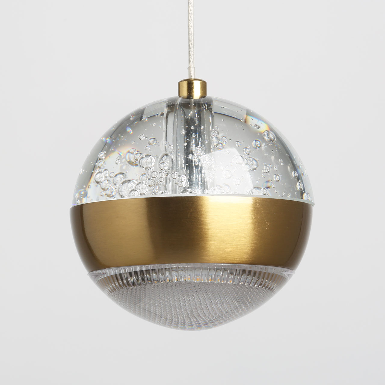 Основание светильника выполнено из комбинации сплавов металлов. Потолочная чаша выполнена из металла и окрашена в цвет латунь. Потолочная чаша закрыта пластиной из сплава алюминия цвета латунь, обработанного по технологии браширования с последующим патинированием.Плафон на подвесе в виде троса: каркас плафона выполнен из сплава алюминия цвета латунь и обработан по технологии браширования с последующим патинированием. В верхней части плафона светодиодный источник света типа SMD chip закрыт стеклом, отлитым в форму и обработанным по технологии пулегозо, при которой в плафоне образуются пузырьки. В нижней части плафона второй светодиодный источник света типа SMD chip закрыт прозрачным акрилом с фактурой сот.