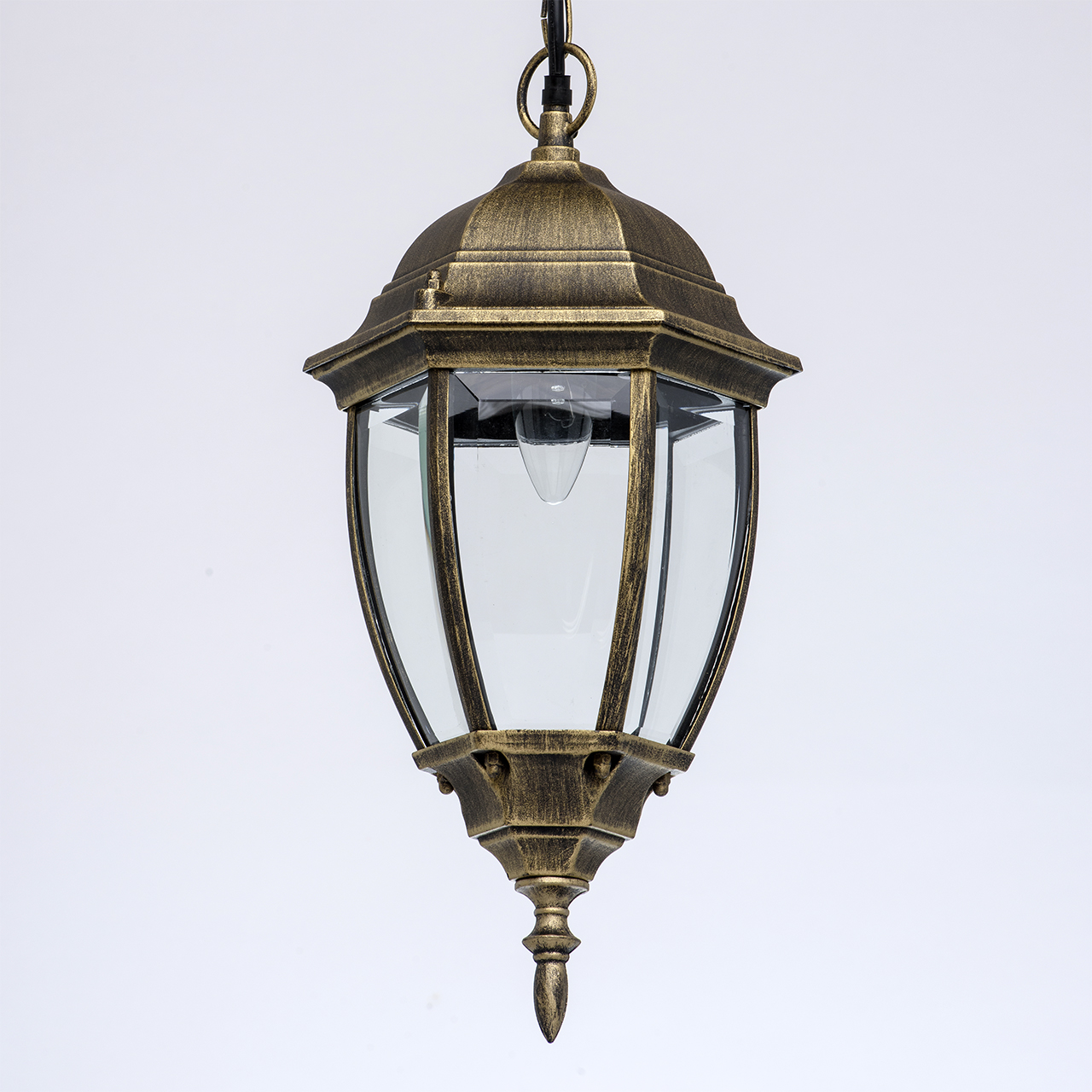 Корпус светильника выполнен из сплава алюминия с цинком и окрашен по технологии порошкового окрашивания в черный цвет с патинированием в цвет старинной позолоты. Плафон составляют одинакового размера пластины стекла, изогнутые по форме.