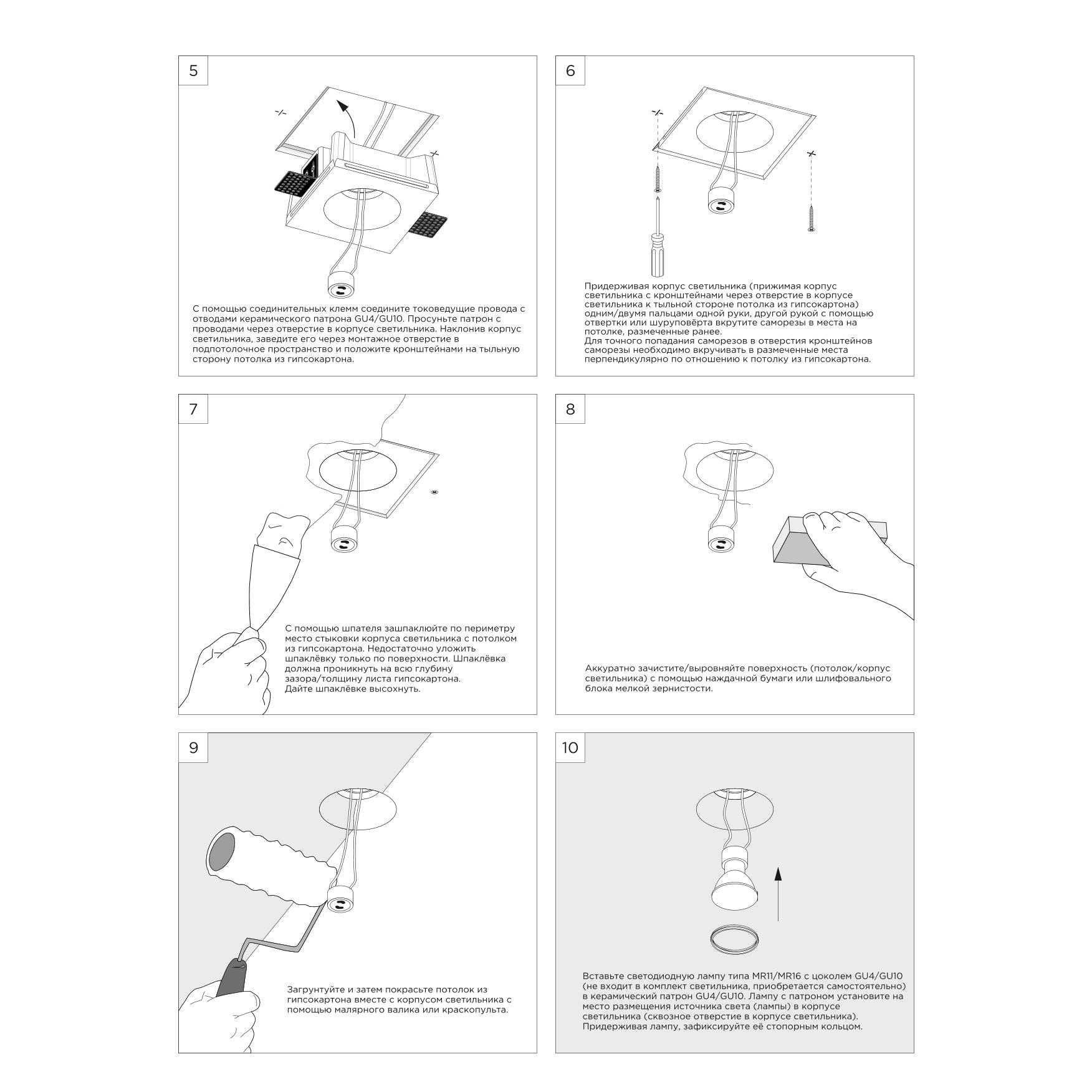 Комплектация: Корпус гипсовый — 1 шт; Кронштейн монтажный регулируемый — 2 шт; Винт установочный — 4 шт; Патрон керамический GU10 — 1 шт; Клемма соединительная — 2 шт; Кольцо стопорное — 1 шт; Руководство по эксплуатации и установке — 1 шт; Упаковка индивидуальная — 1 шт;
