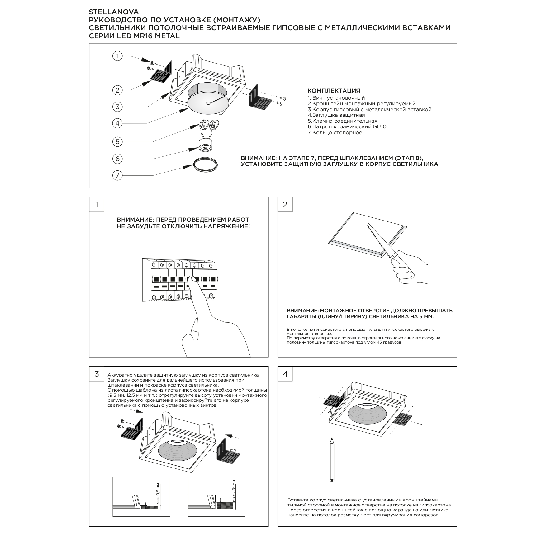 Комплектация: Корпус гипсовый со вставкой из 100% МЕДИ — 1 шт; Заглушка защитная — 2 шт; Кронштейн монтажный регулируемый — 4 шт; Винт установочный — 8 шт; Патрон керамический GU10 — 2 шт; Клемма соединительная — 2 шт; Кольцо стопорное — 2 шт; Перчатки монтажные — 1 шт; Руководство по эксплуатации и установке — 1 шт; Упаковка индивидуальная — 1 шт;